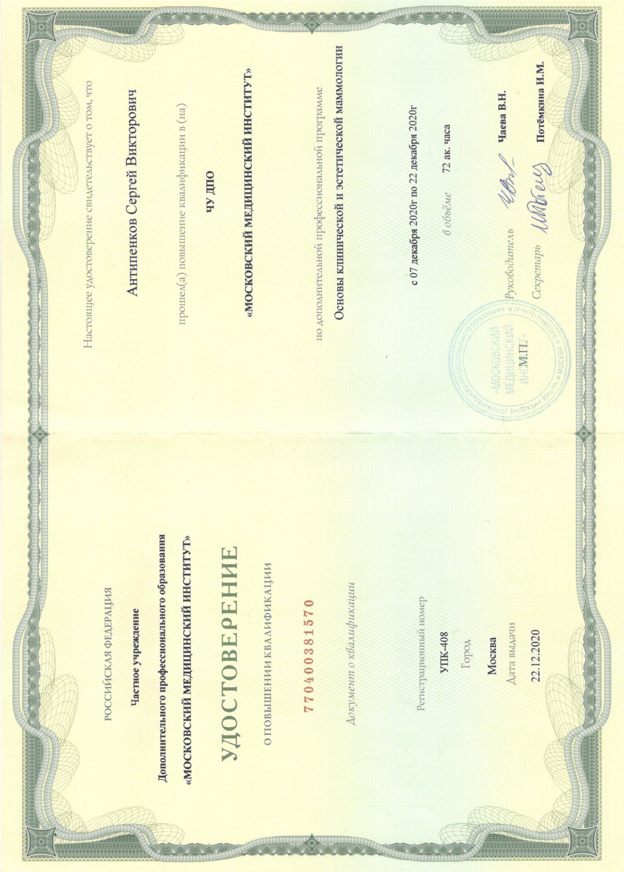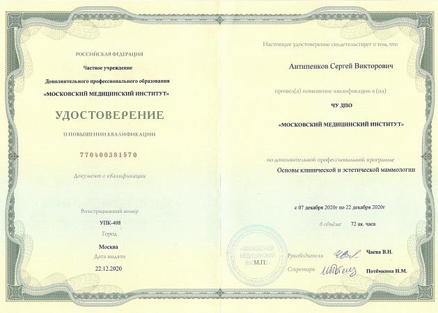 - 2020 г. – Программа повышения квалификации «Клиническая и эстетическая маммология».