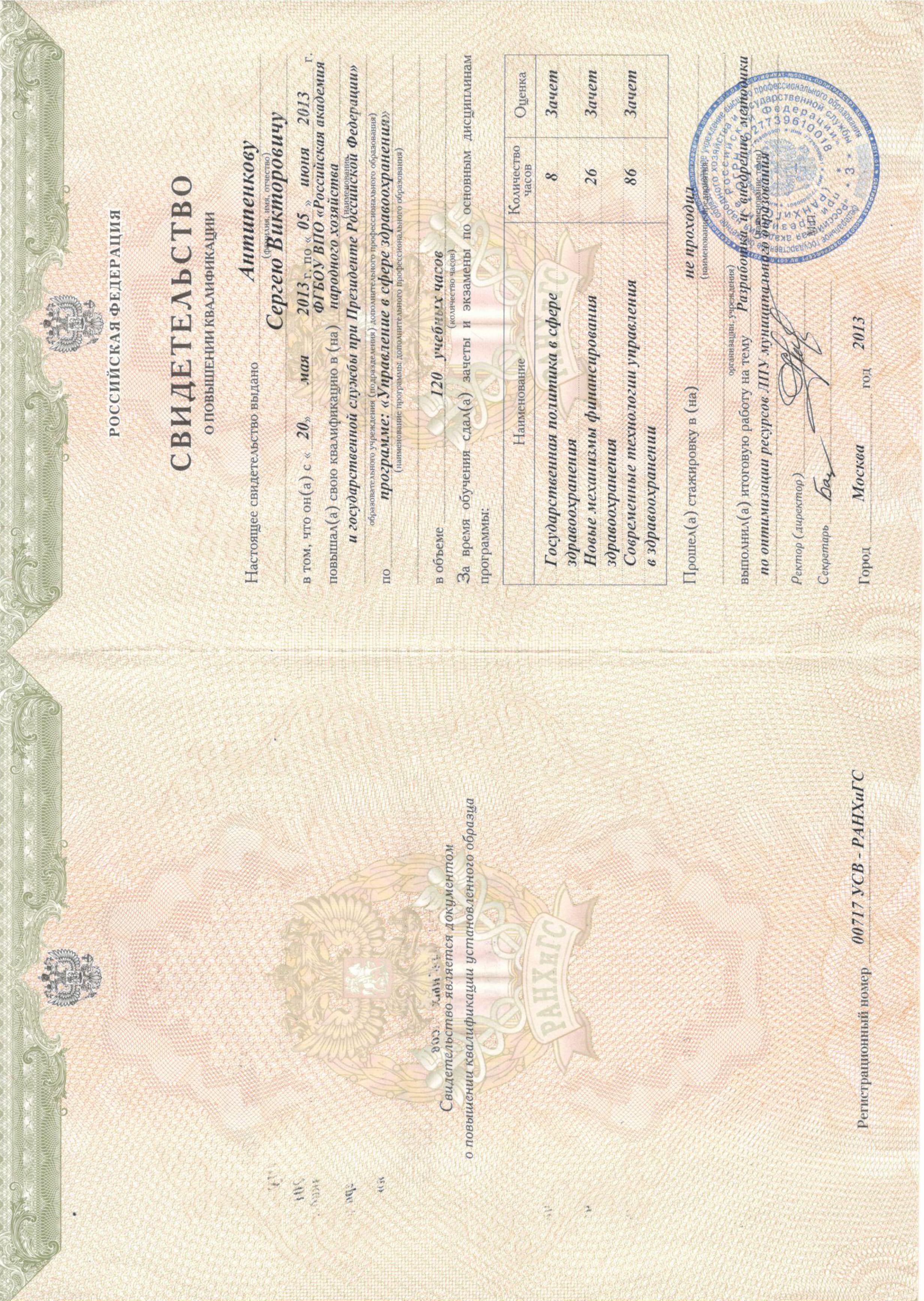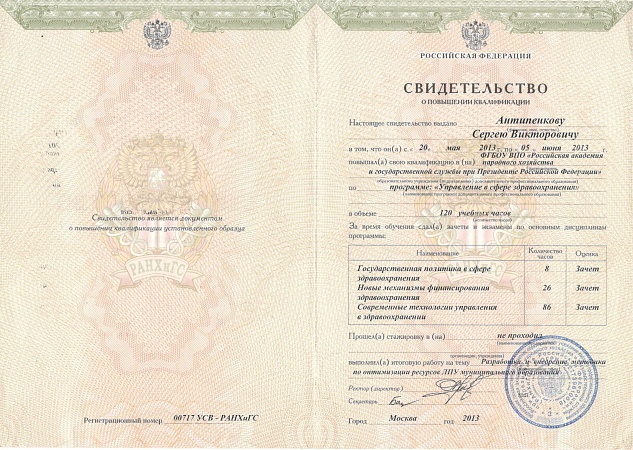 - 2009 г. – РАНХи ГС «Управление в сфере здравоохранения»;