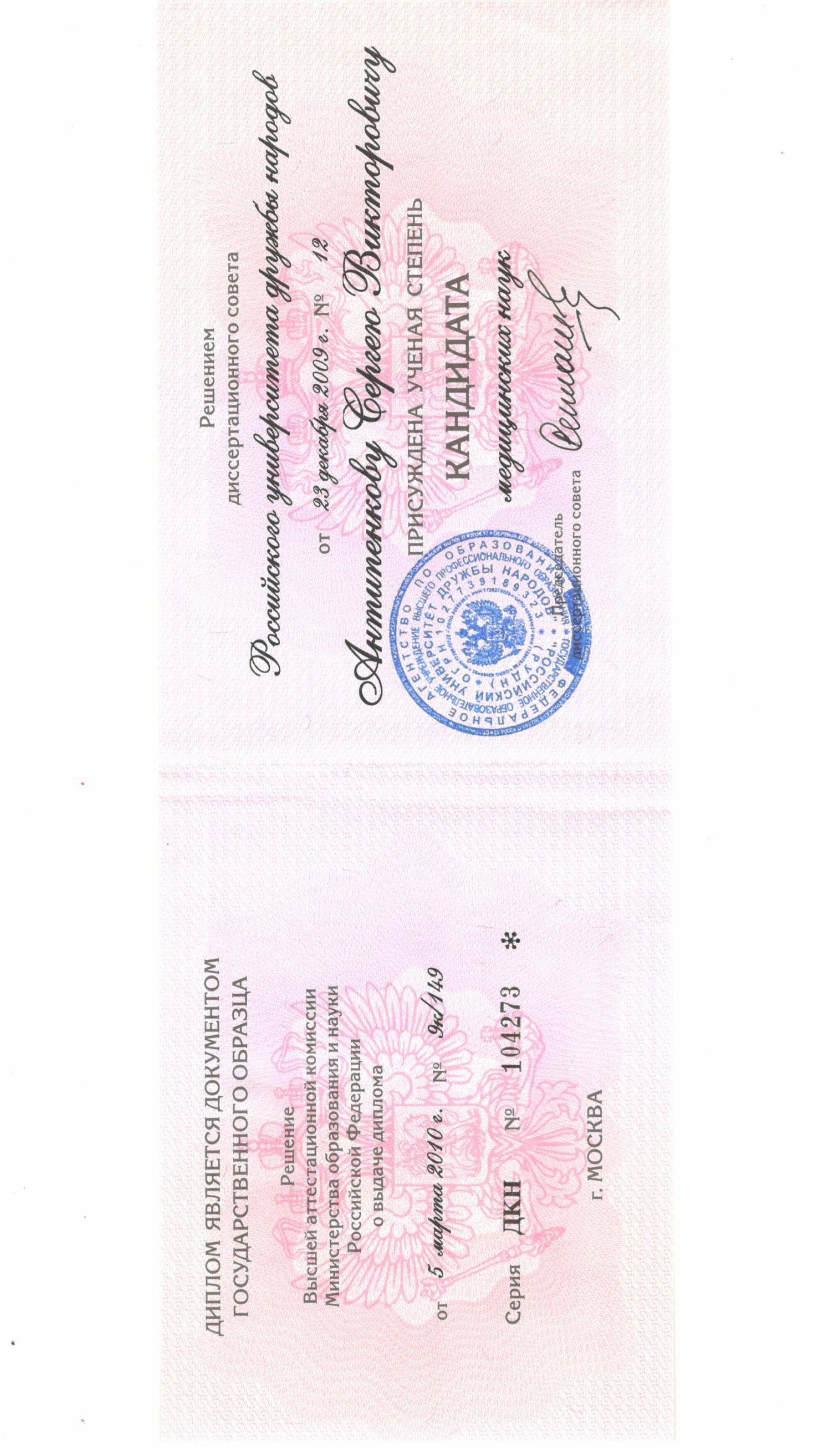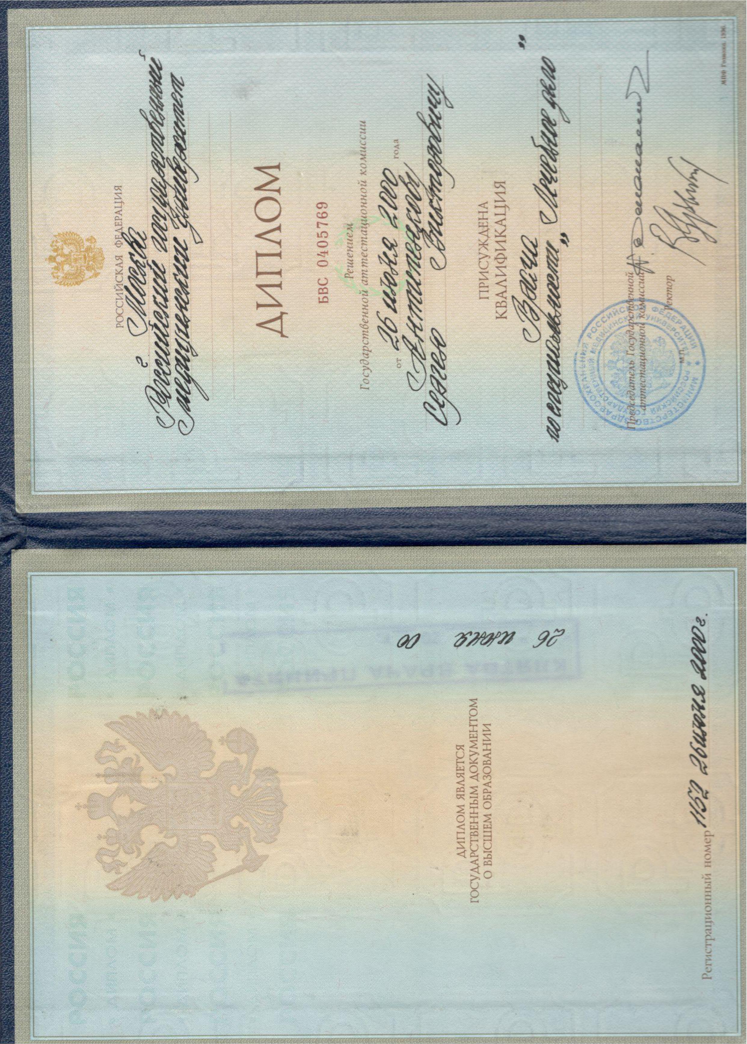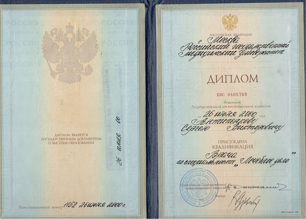 - 2000 г. – Российский государственный медицинский университет им. Н.И. Пирогова.
