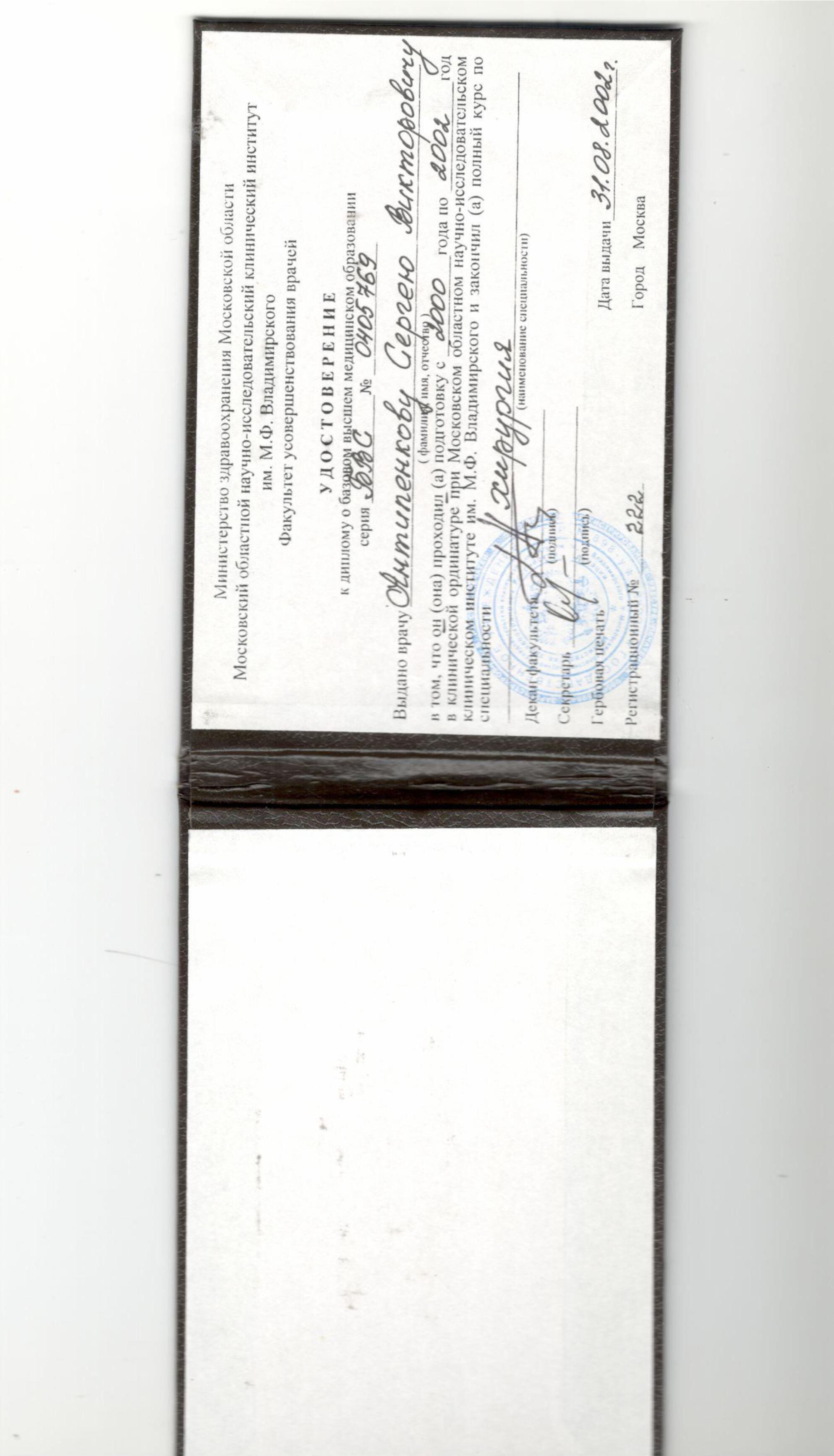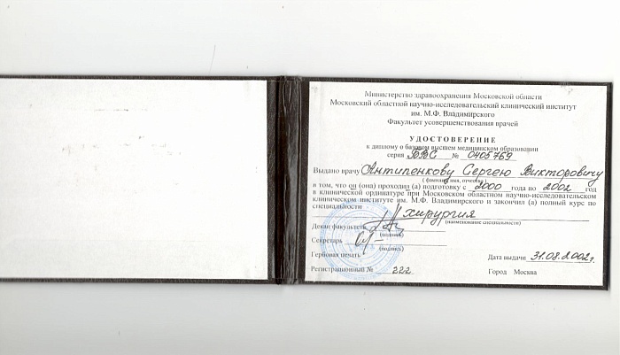 - 2002 г. – Клиническая ординатура по специальности "Хирургия" на кафедре абдоминальной хирургии МОНИКИ им. М.Ф. Владимирского