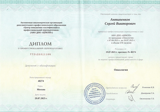 Антипенков Сергей Викторович – онколог – маммолог, хирург. Стаж работы - более 25 лет. Кандидат медицинских наук. Автор более 20 научных публикаций. Член Национальной Ассоциации управленцев в сфере здравоохранения.