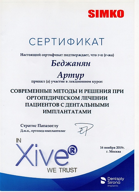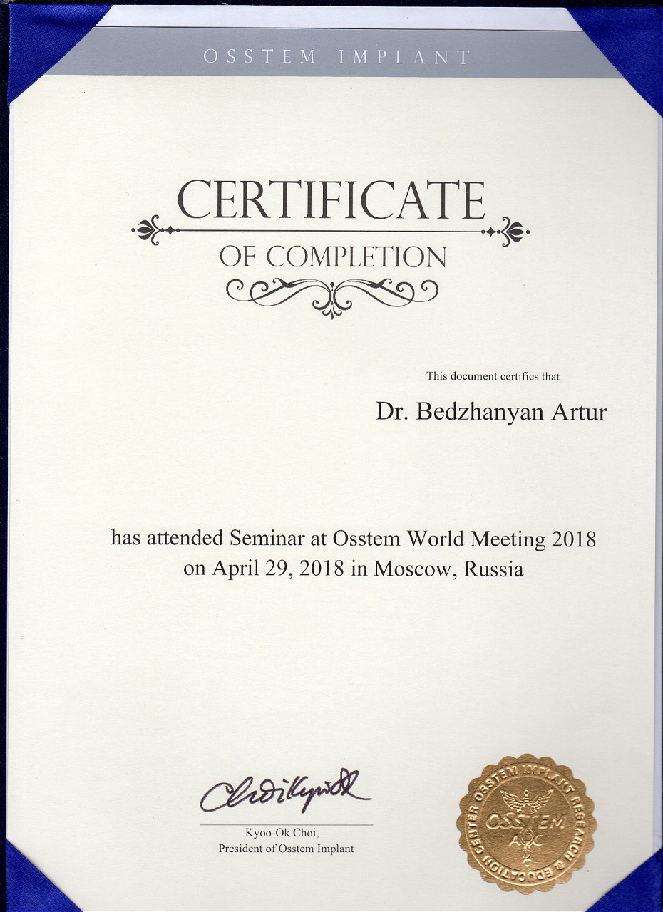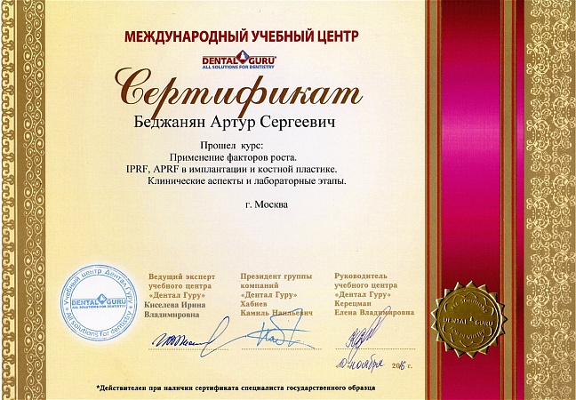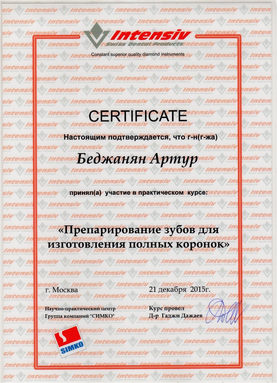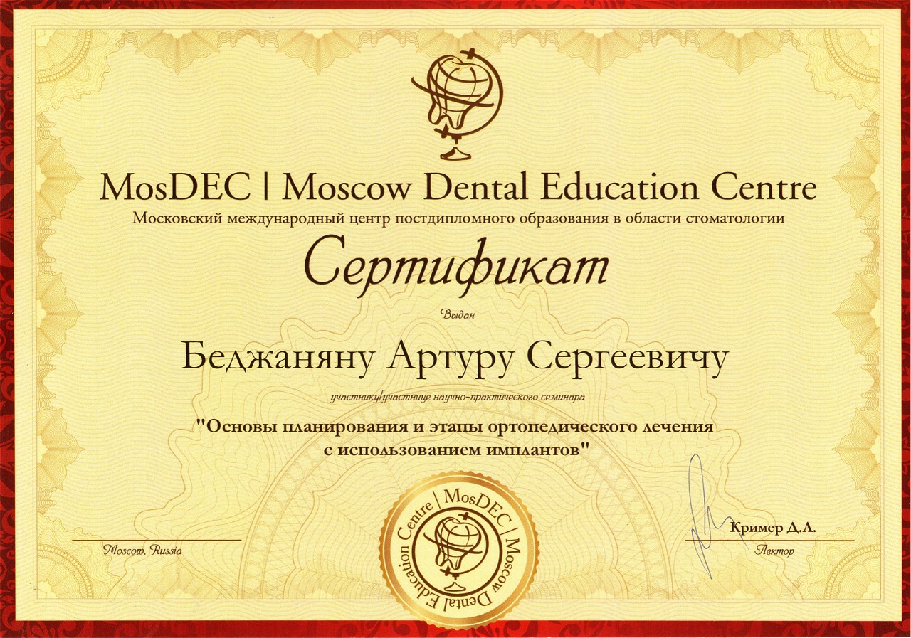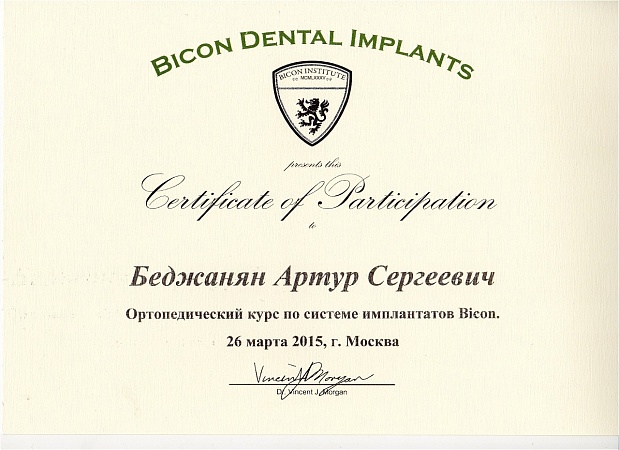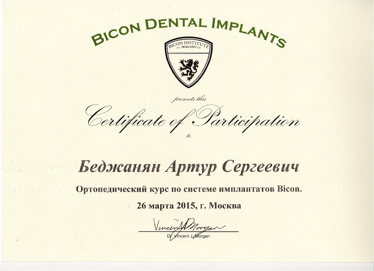 - 2015 г. - «Ортопедический курс по системе имплантатов Bicon», «Bicon Dental Implants»