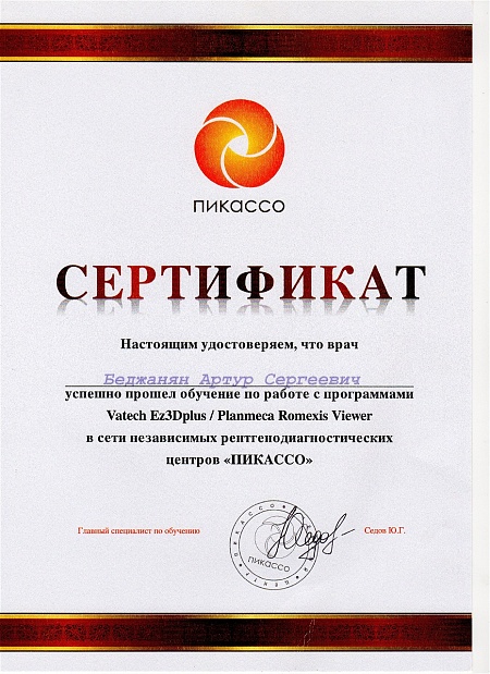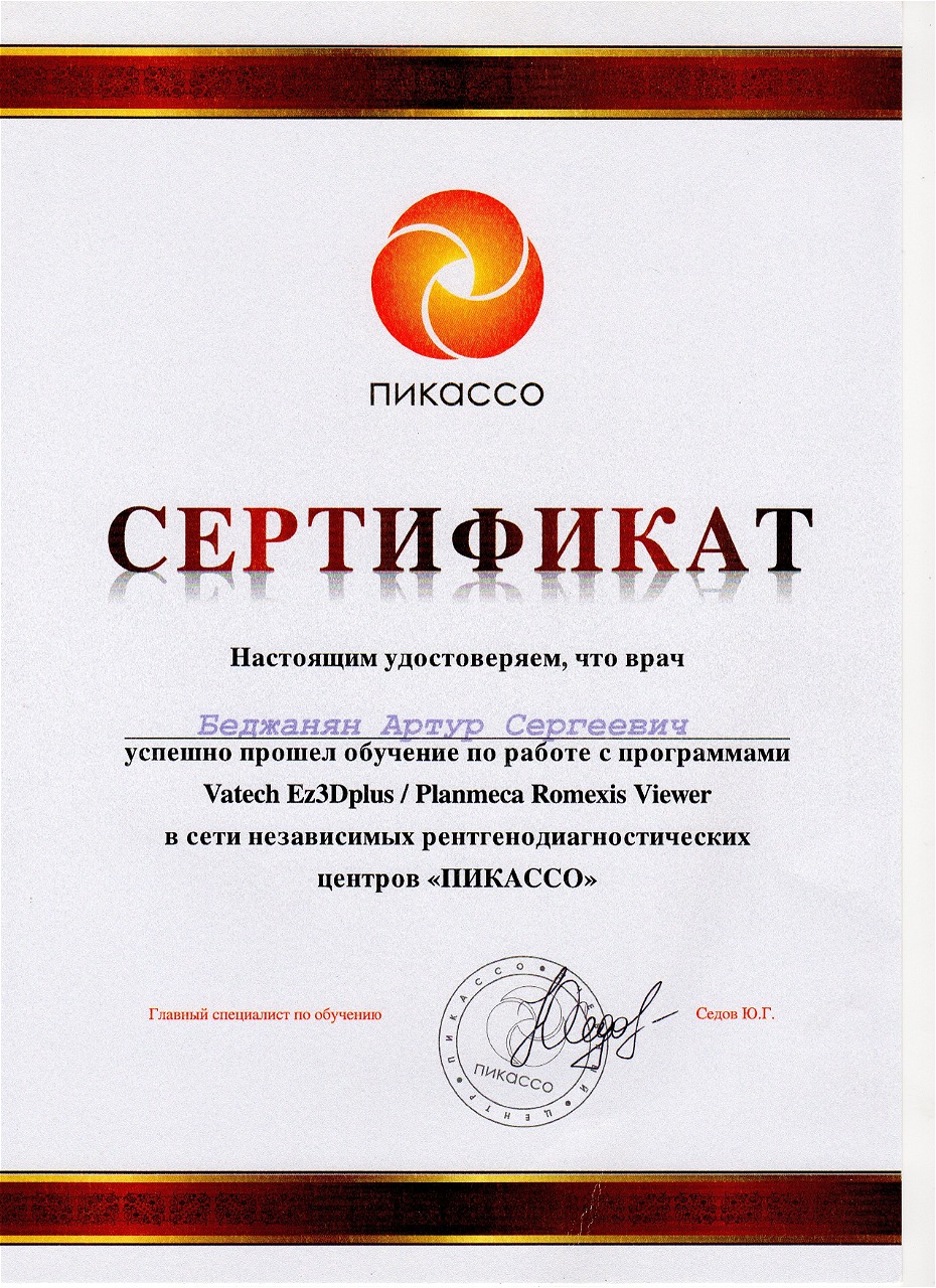 - 2013 г. - Работа с программами по КЛКТ диагностике Vatech/ Planmeca, «Пикассо»