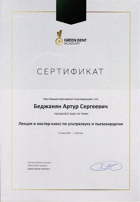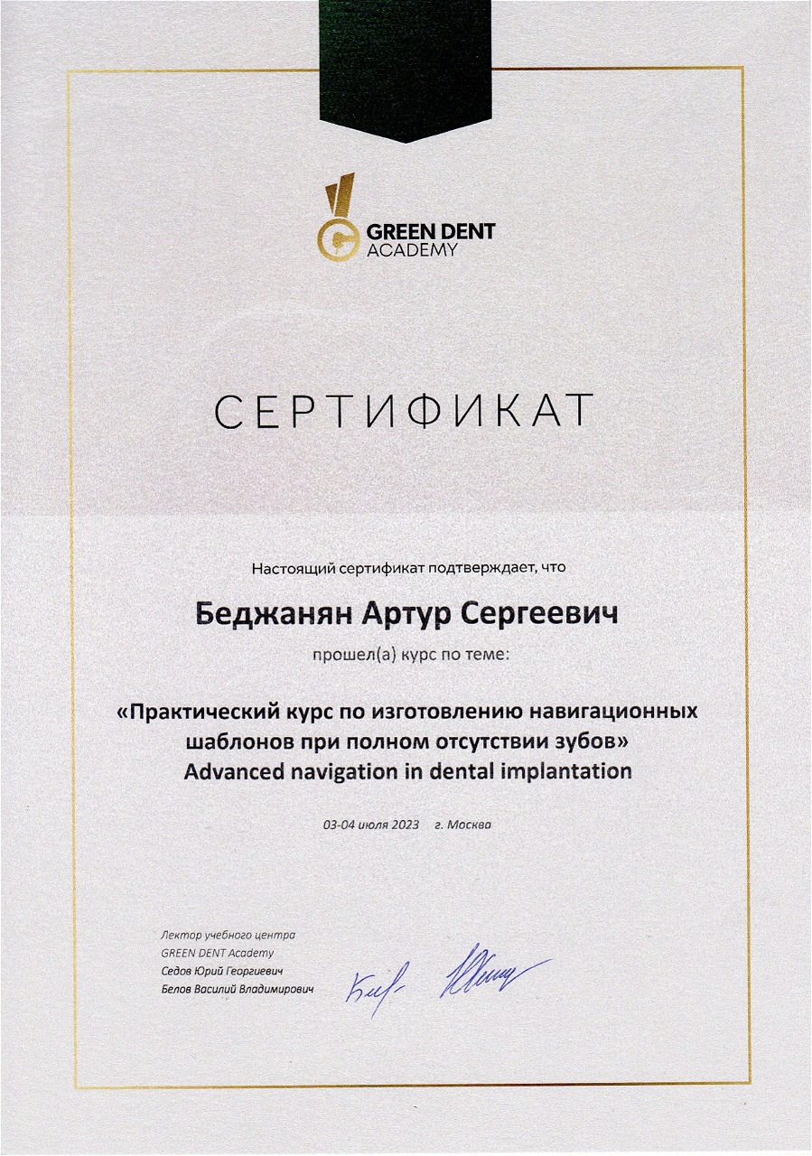 - 2023 г. - Практический курс «Advanced navigation in dental implantation. Изготовление навигационных шаблонов при полном отсутствии зубов», GD Academy