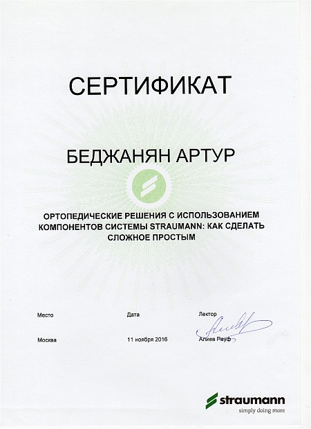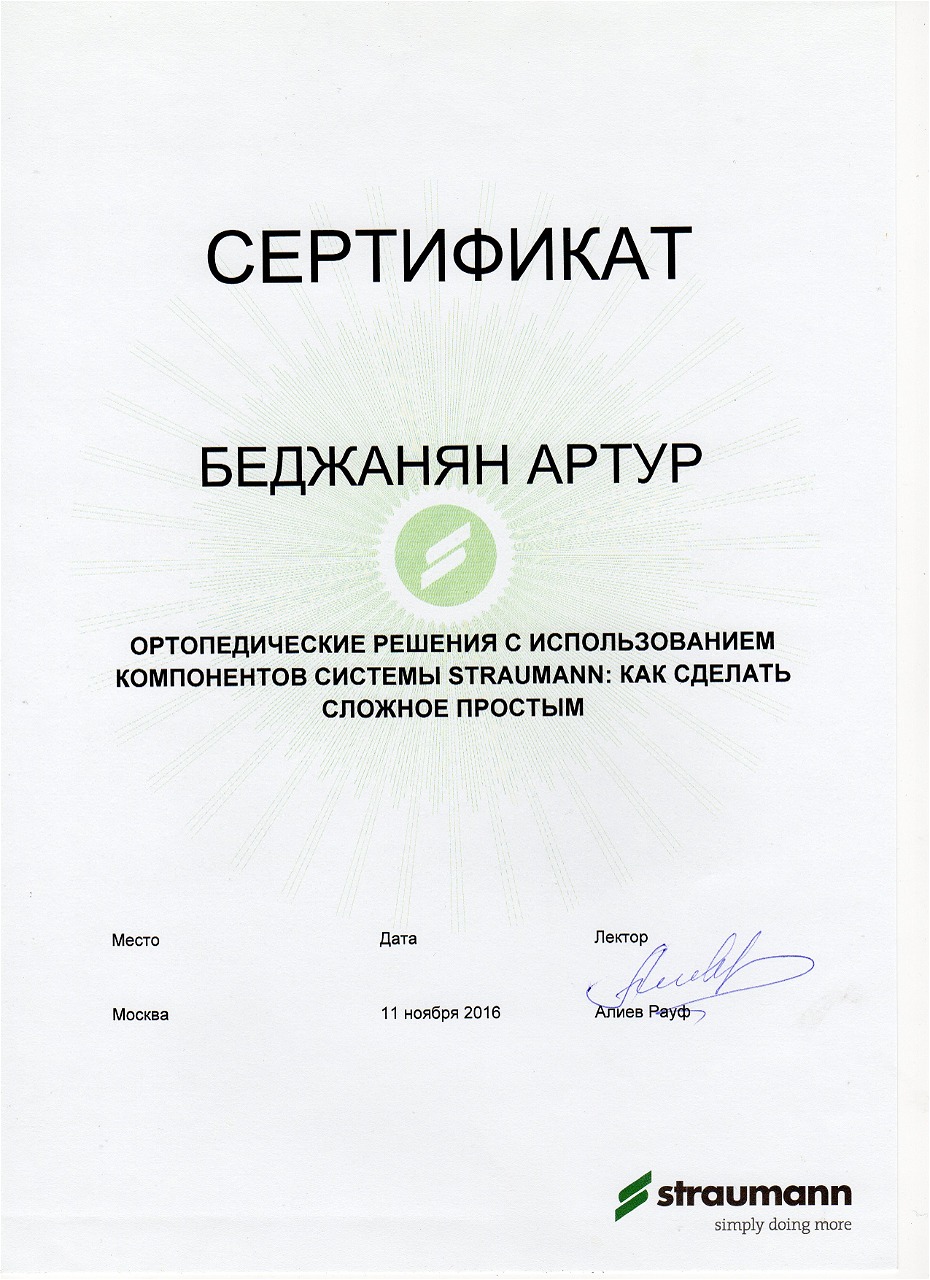 - 2016 г. - «Ортопедические решения с использованием компонентов системы Straumann: как сделать сложное простым», «Straumann»