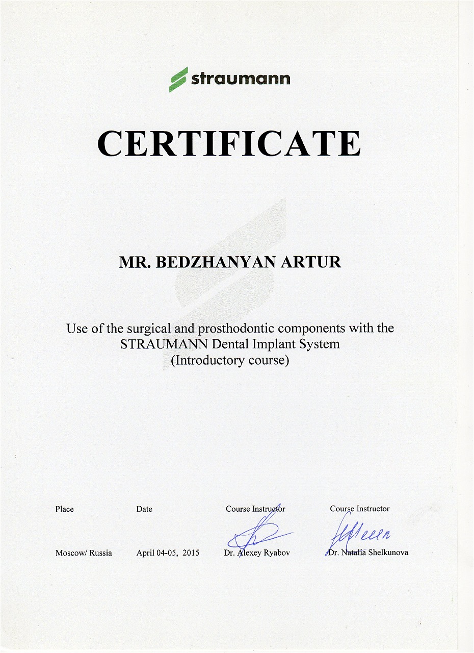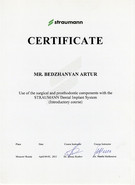 - 2015 г. - «Use of the surgical and prosthodontic components with the Straumann Dental implant system», «Straumann»