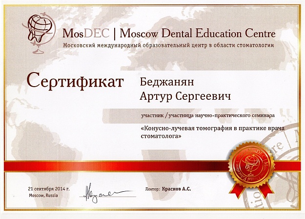 - 2014 г. - Научно-практический семинар «Конусно-лучевая томография в практике врача стоматолога», «MosDec»