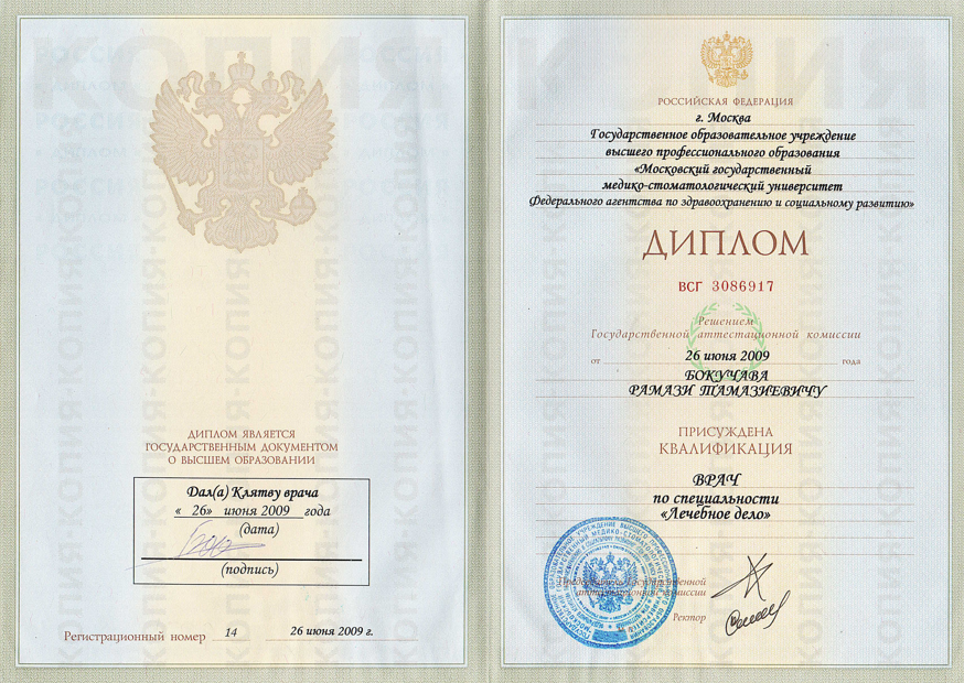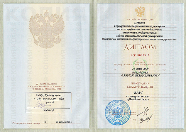 - 2009 г. - Московский государственный медико-стоматологический университет им. А.И. Евдокимова, Москва Лечебный факультет, Лечебное дело.