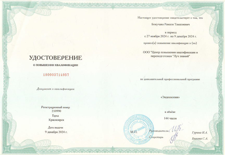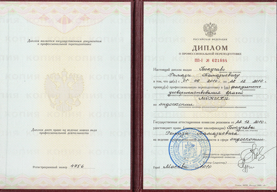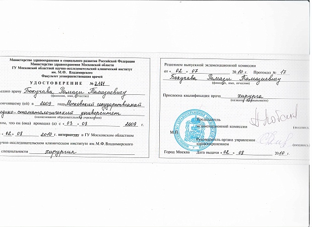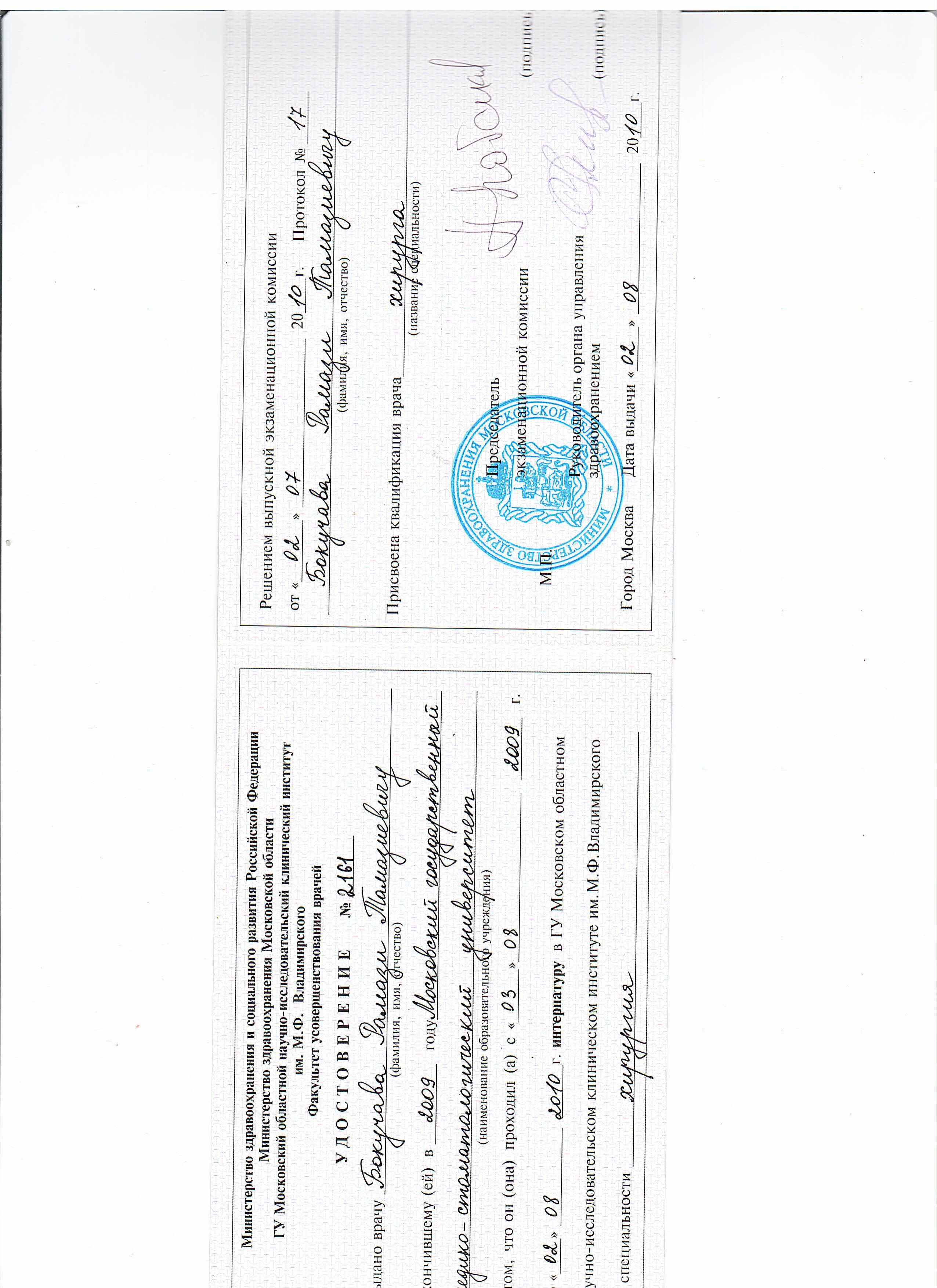 В 2010г. Проходил первичную специализацию по специальности “Эндоскопия”, повышение квалификации, ФУВ МОНИКИ