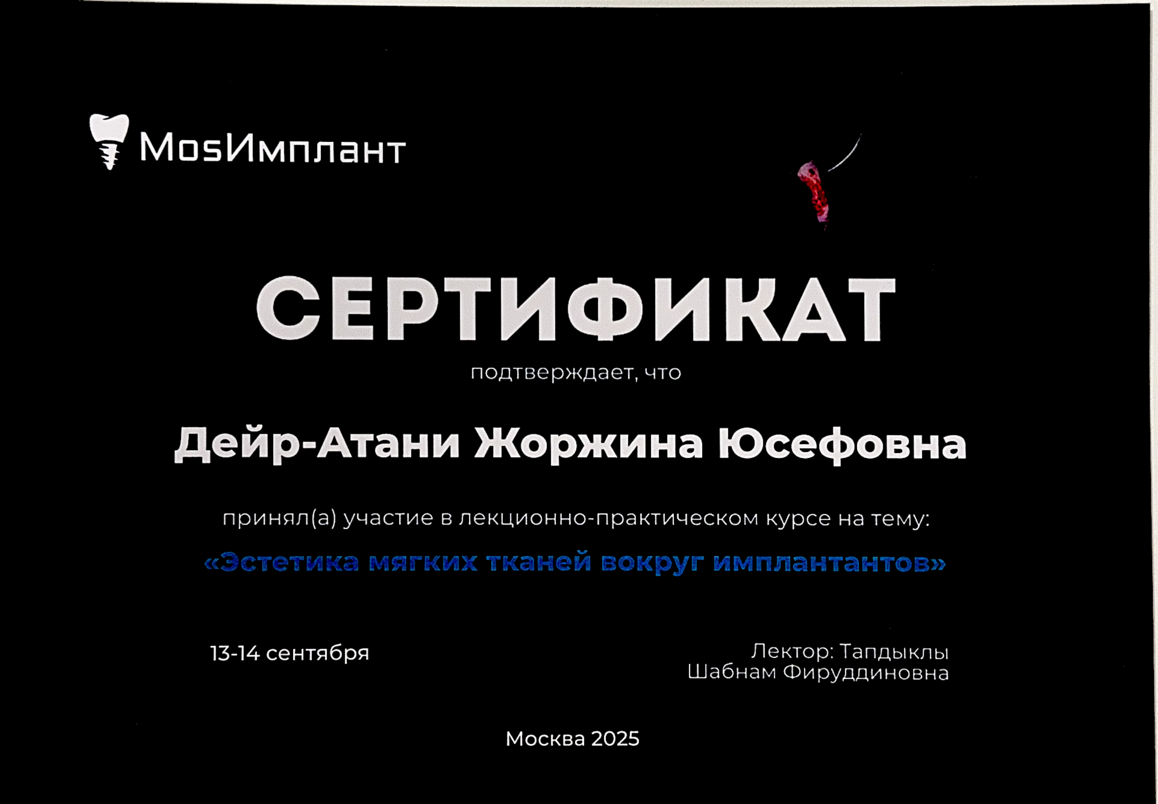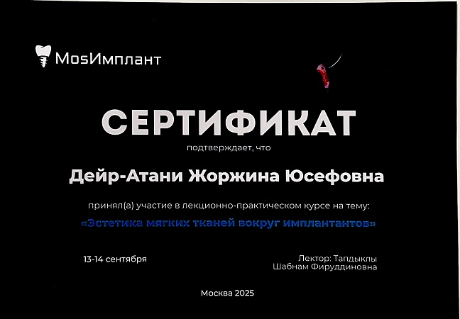 - Сентябрь 2025 г. - практический курс «Эстетика мягких тканей вокруг имплантантов», у доктора Тапдыклы Шабанам Фируддинова.