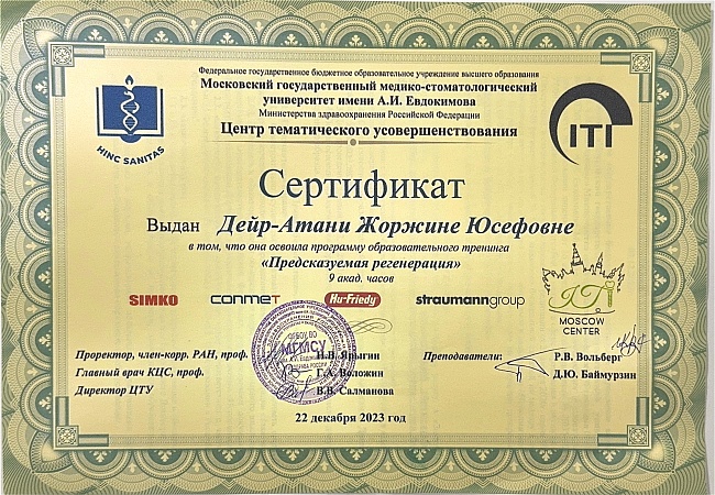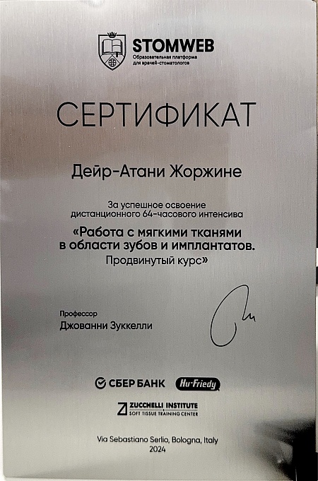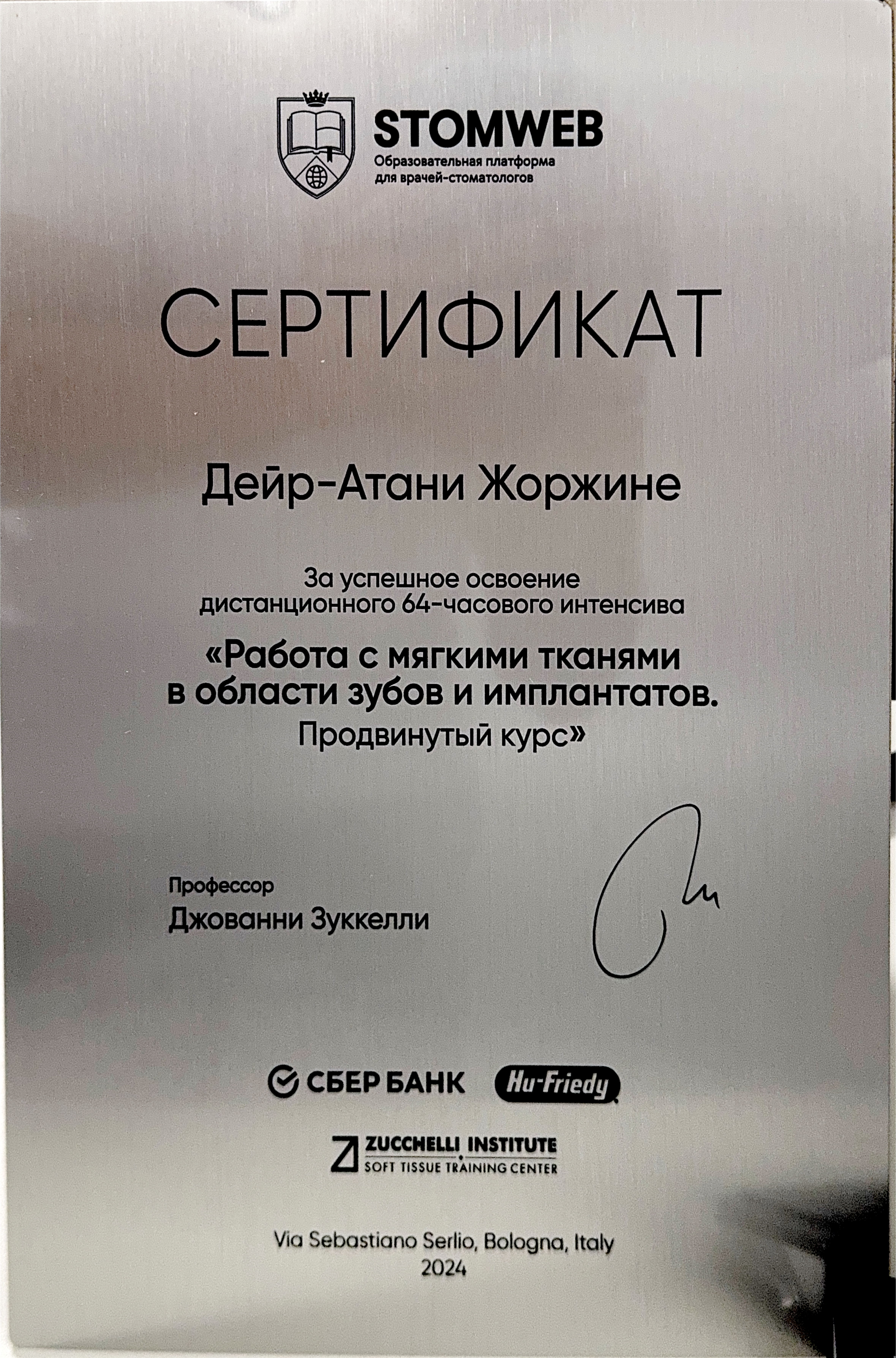 - Ноябрь 2024 г. - прошла курс интенсива по «Работа с мягкими тканями в области Зубов и имплантатов» у профессора Джованни Зуккели.