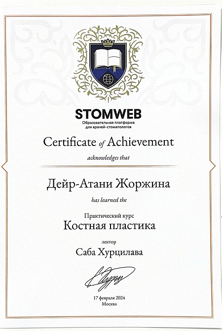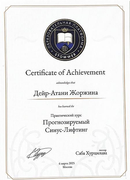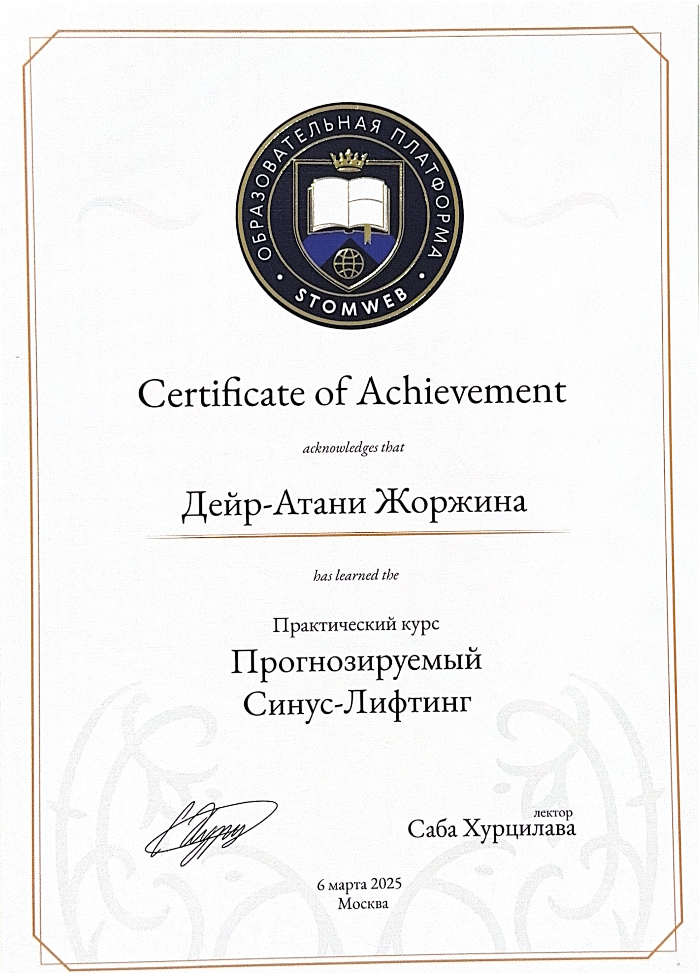 - Март 2025 г. - курс «Прогнозируемый Синус-Лифтинг», у хирурга Саба Хурцилава.