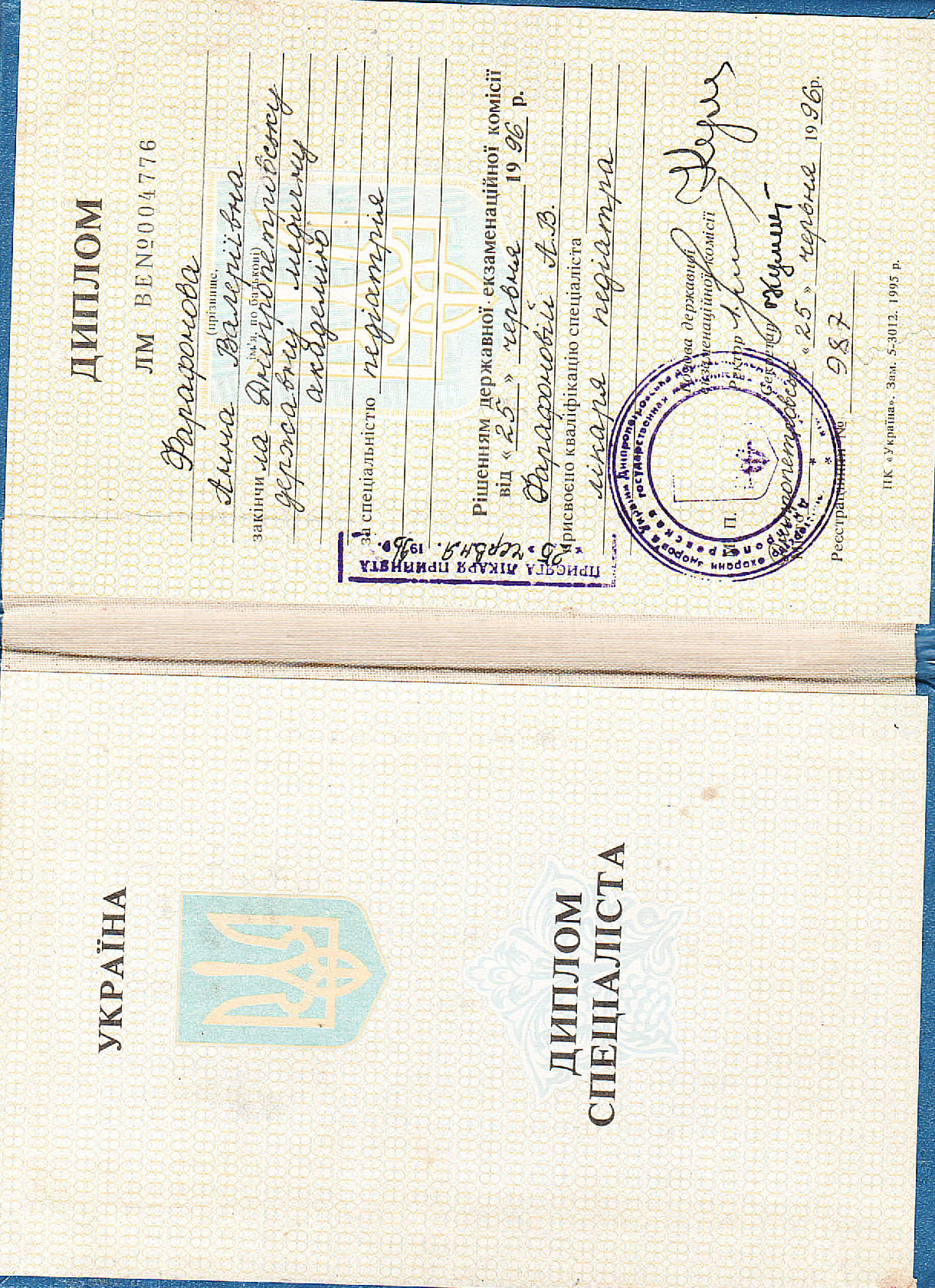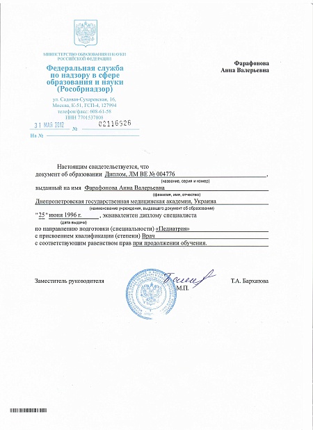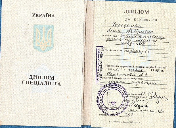 - 1996 г. - ДГМА по специальности «Педиатрия»;