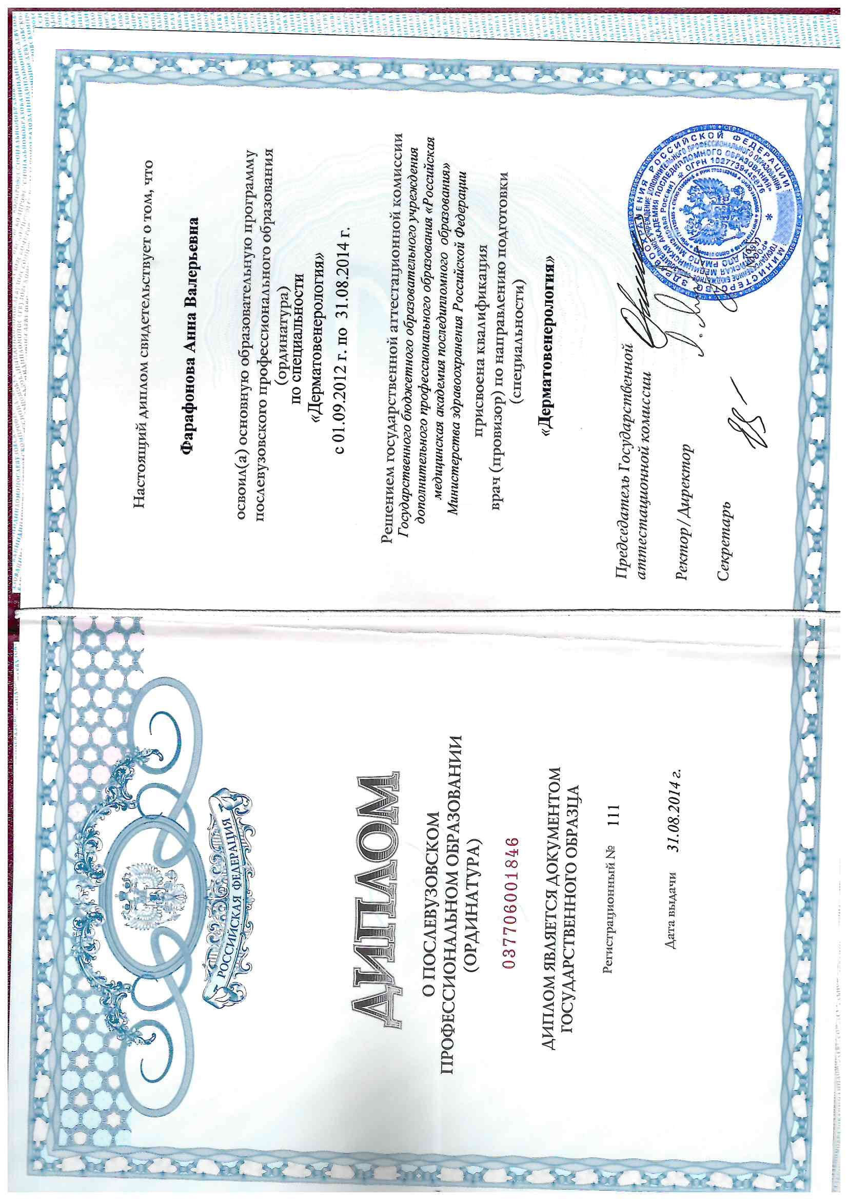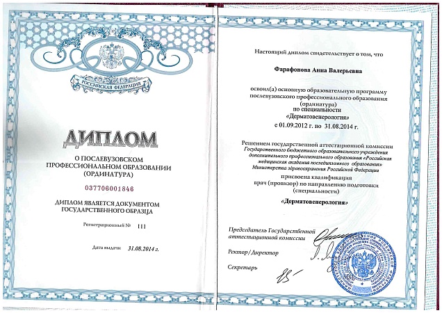 - 2014 г. - РМАПО. Клиническая ординатура по специальности «Дерматовенерология»;