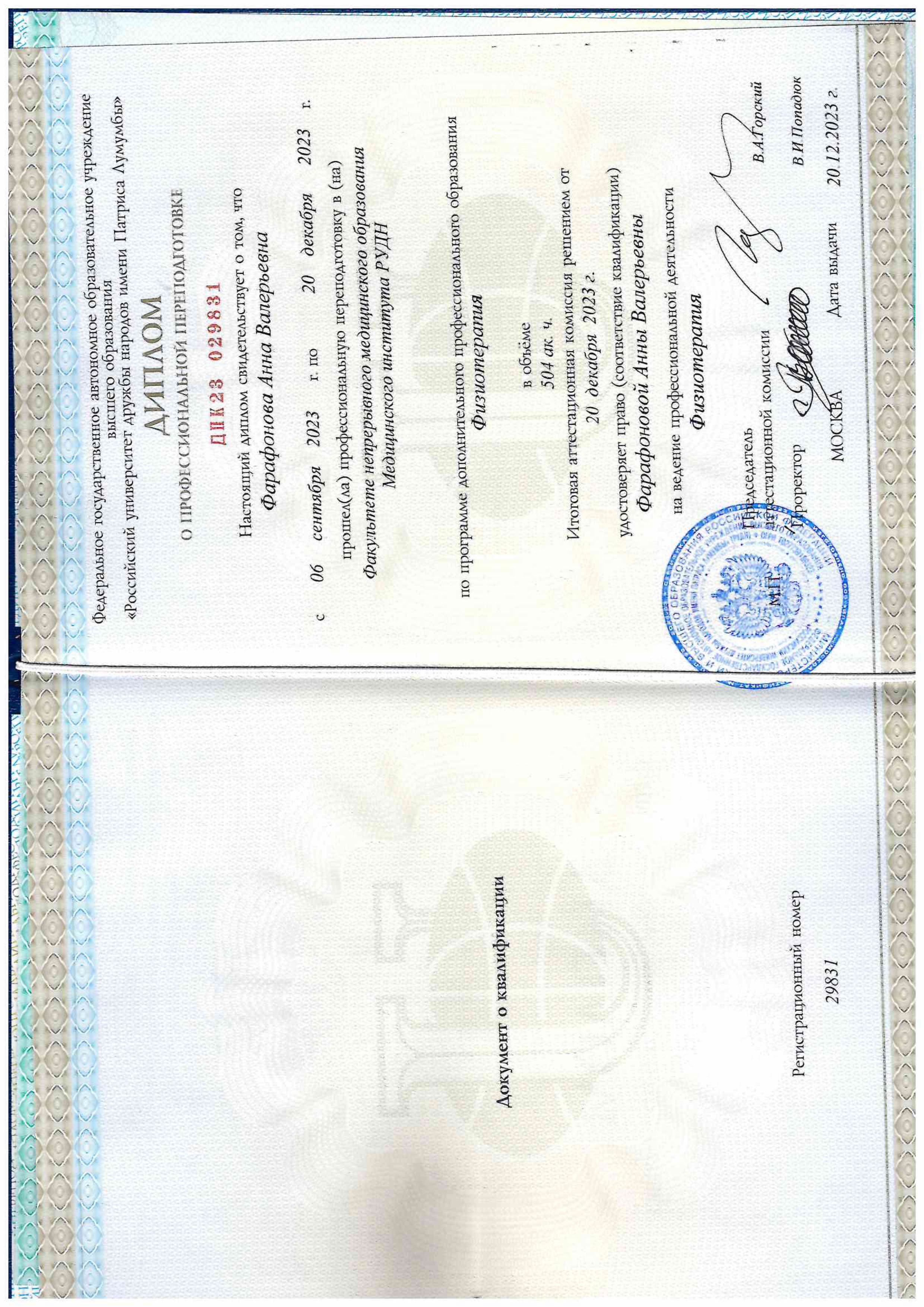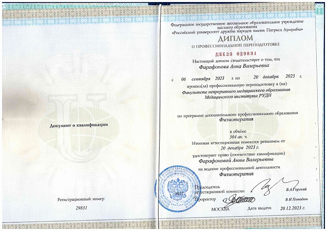 - 2023 г. - РУДН. Профпереподготовка по специальности «Физиотерапия».