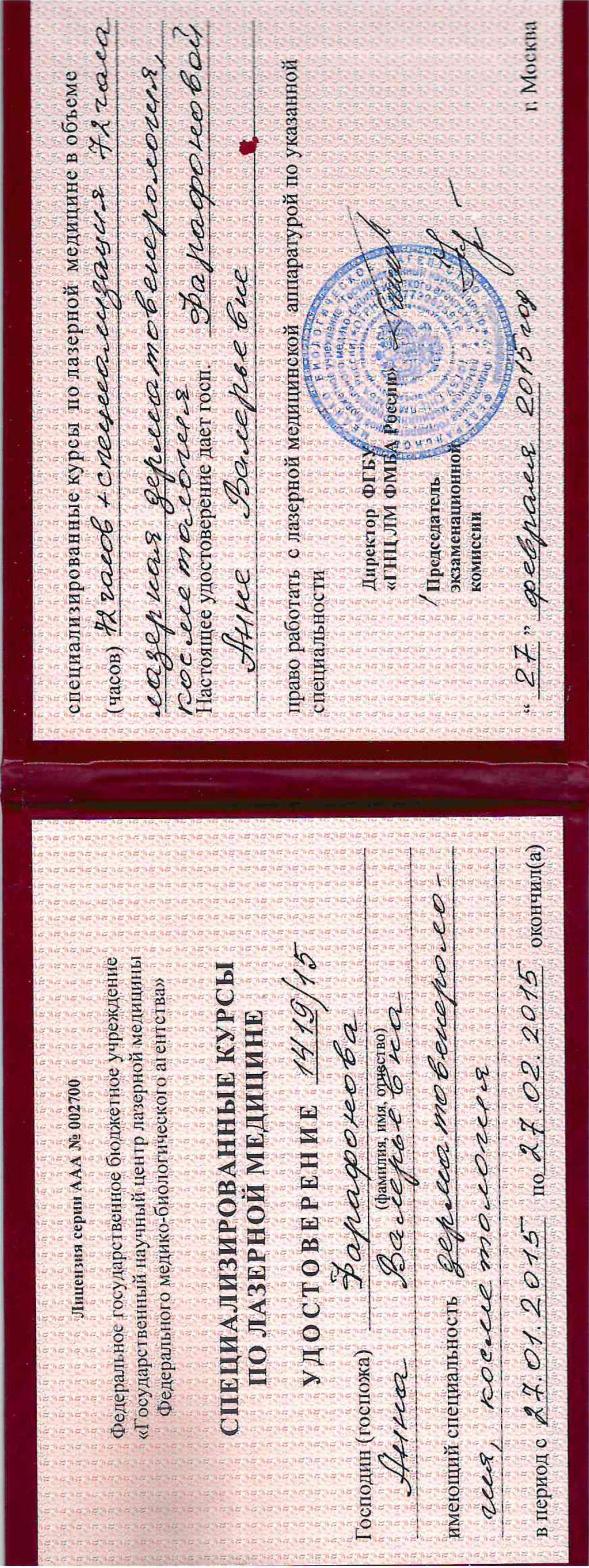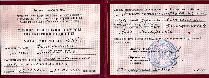 - 2014 г. - ФГБУ ГНЦ лазерной медицины ФМБА. Специализированные курсы по лазерной медицине 144 ч.;