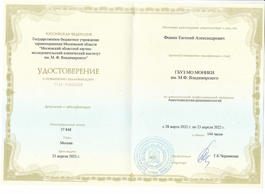 - 2022 г. - Московский областной научно-исследовательский клинический институт им М.Ф. Владимирского по специальности "Анестезиология и реаниматология".