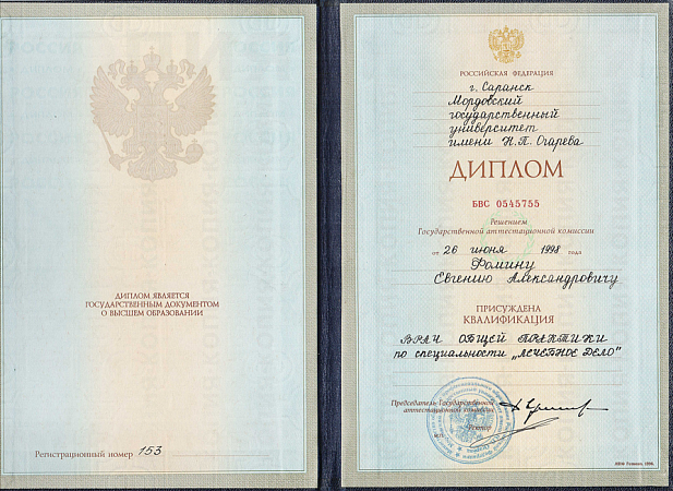 - 1998 г. - Мордовский государственный университет им. Н.П. Огарева. Врач общей практики по специальности "Лечебное дело";