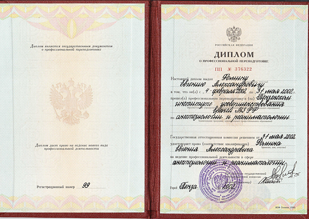 - 2002 г. - Пензенский институт усовершенствования врачей МЗ РФ по анестезиологии и реаниматологии, специальность "Врач-анестезиолог-реаниматолог".