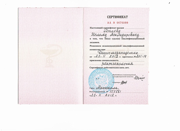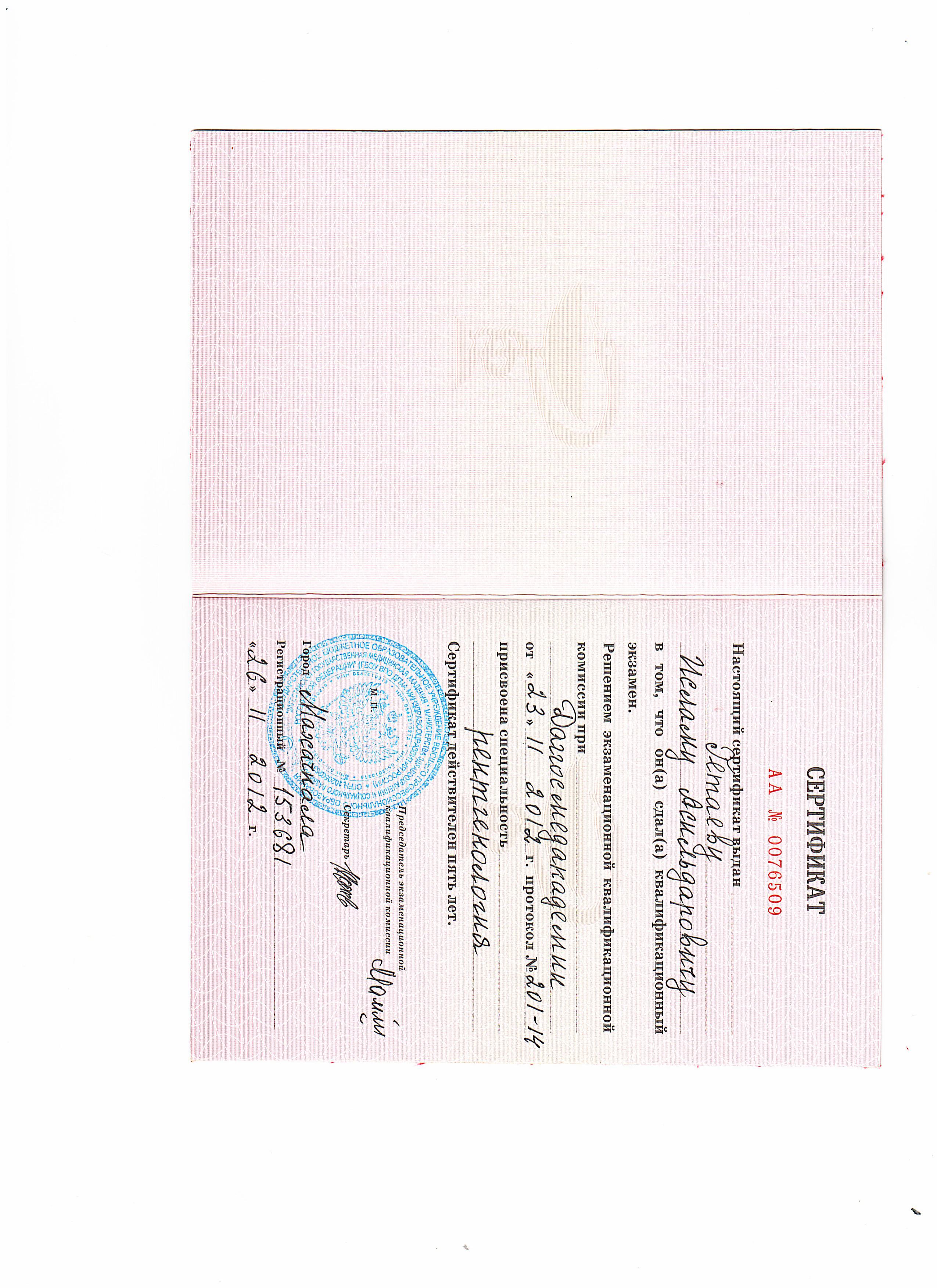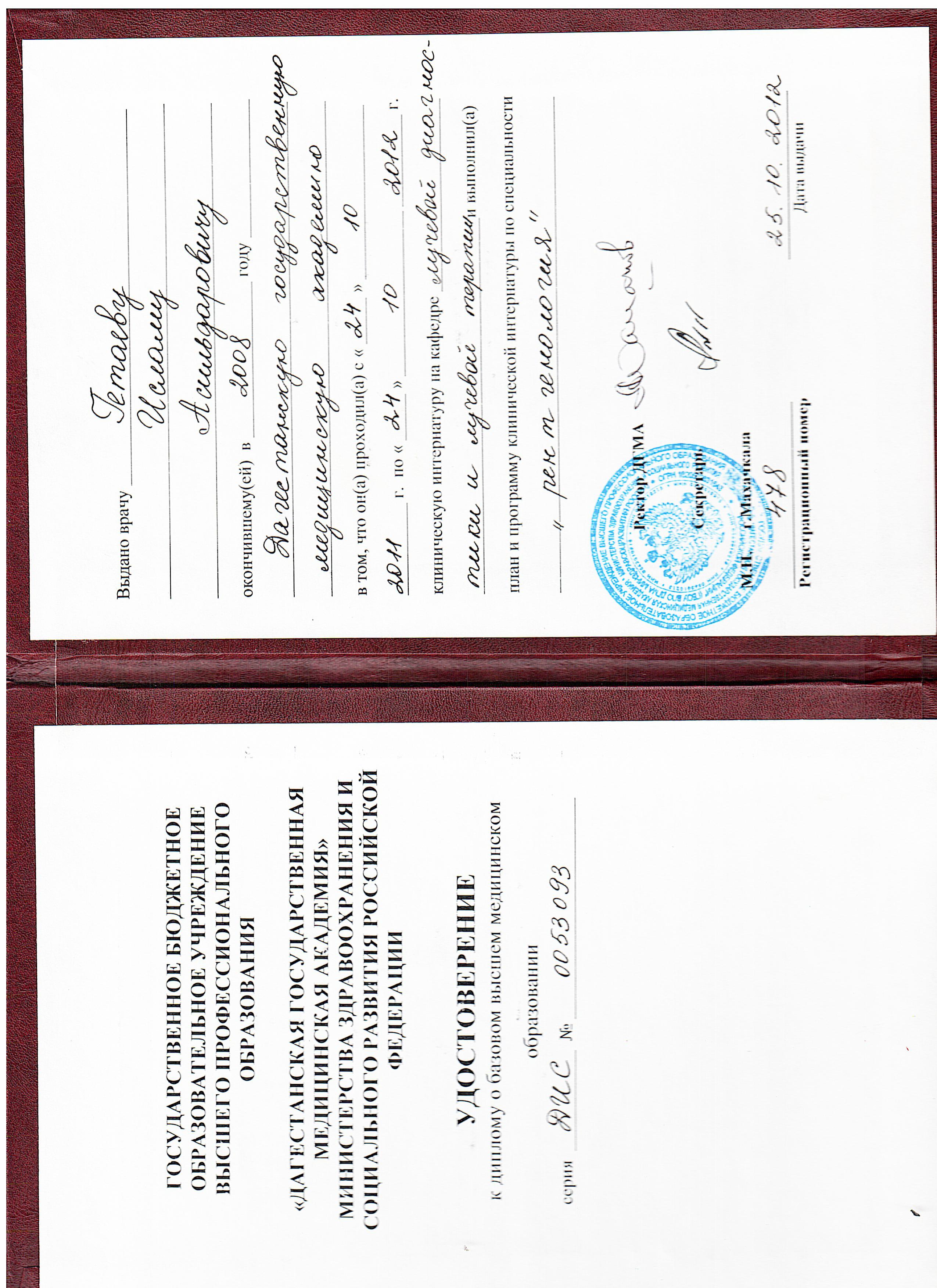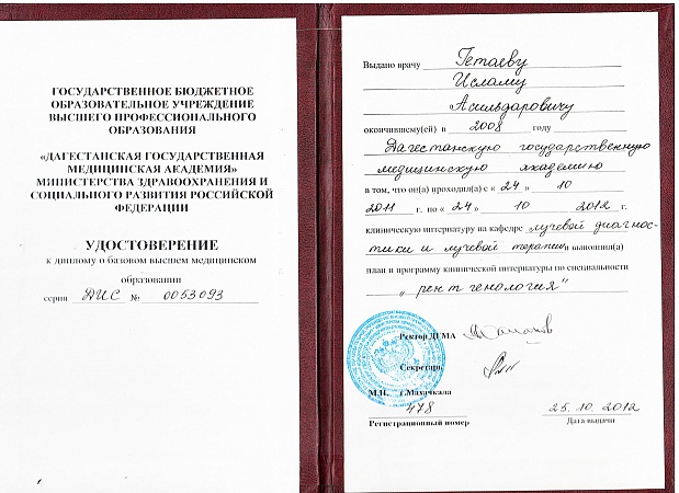 - 2012 г. - Интернатура по специальности "Рентгенология", ДГМА, кафедра лучевой диагностики.