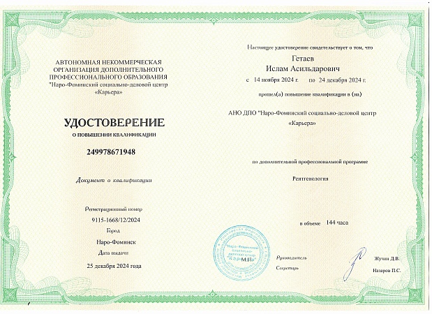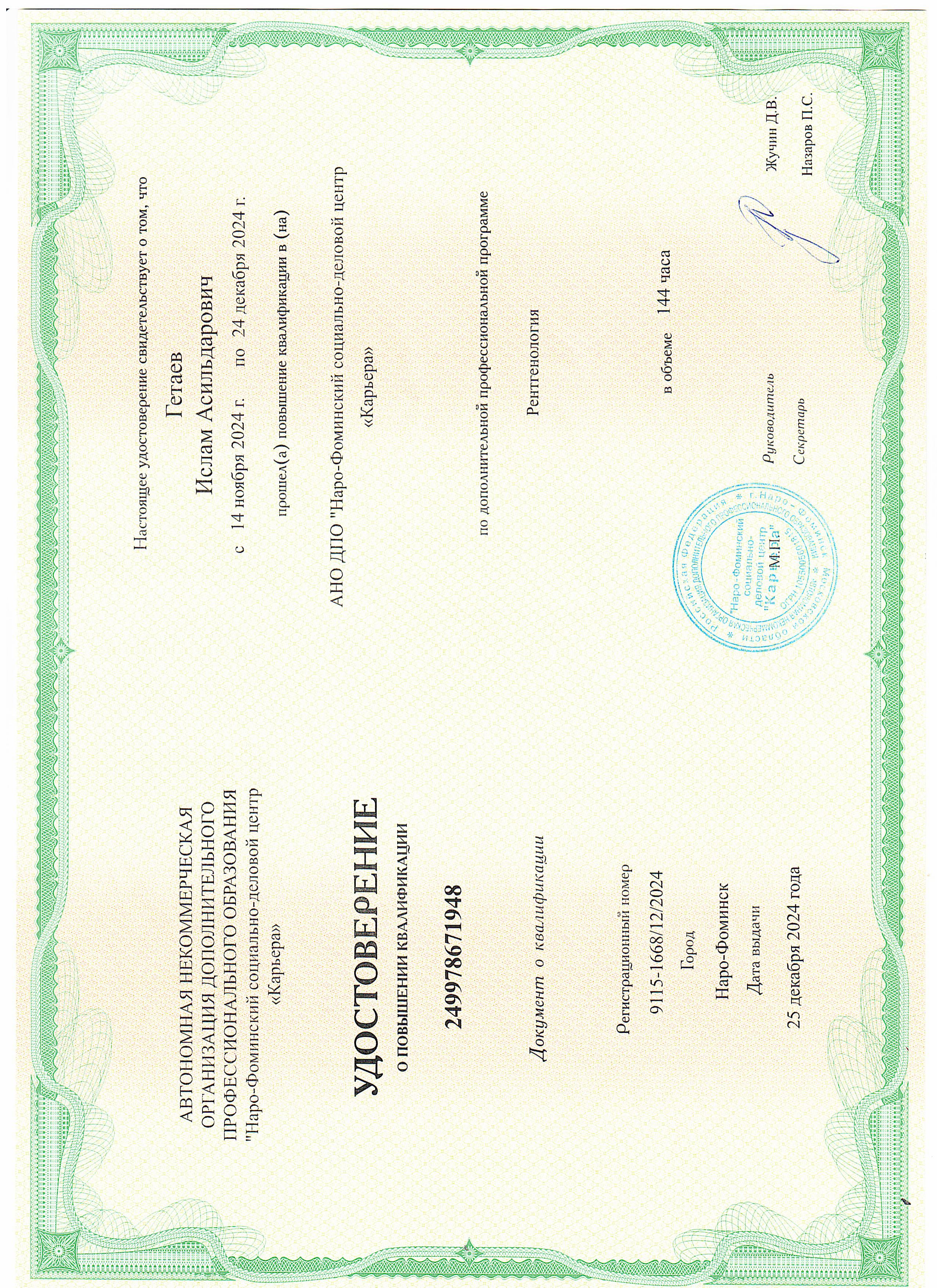 Гетаев Ислам Асильдарович - врач-рентгенолог первой квалификационной категории с опытом работы в области лучевой диагностики более 10-ти лет.