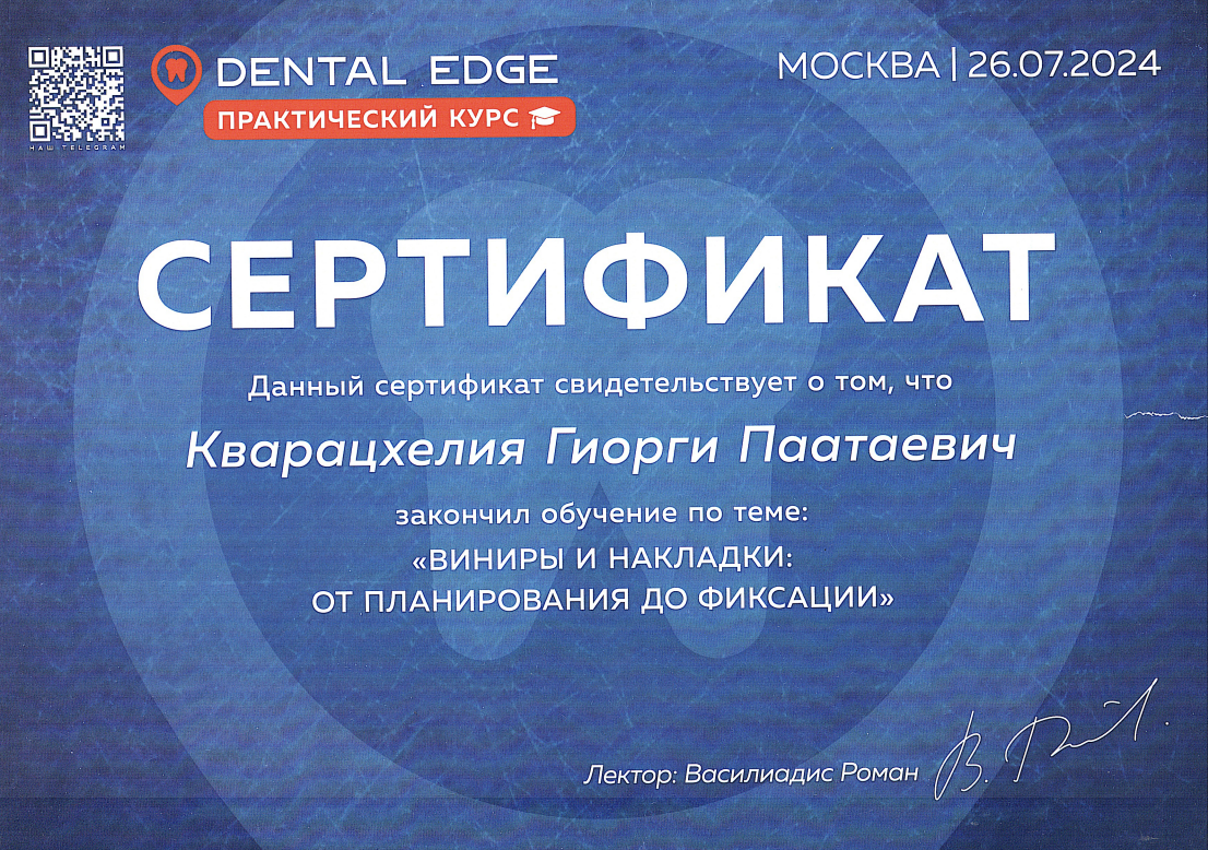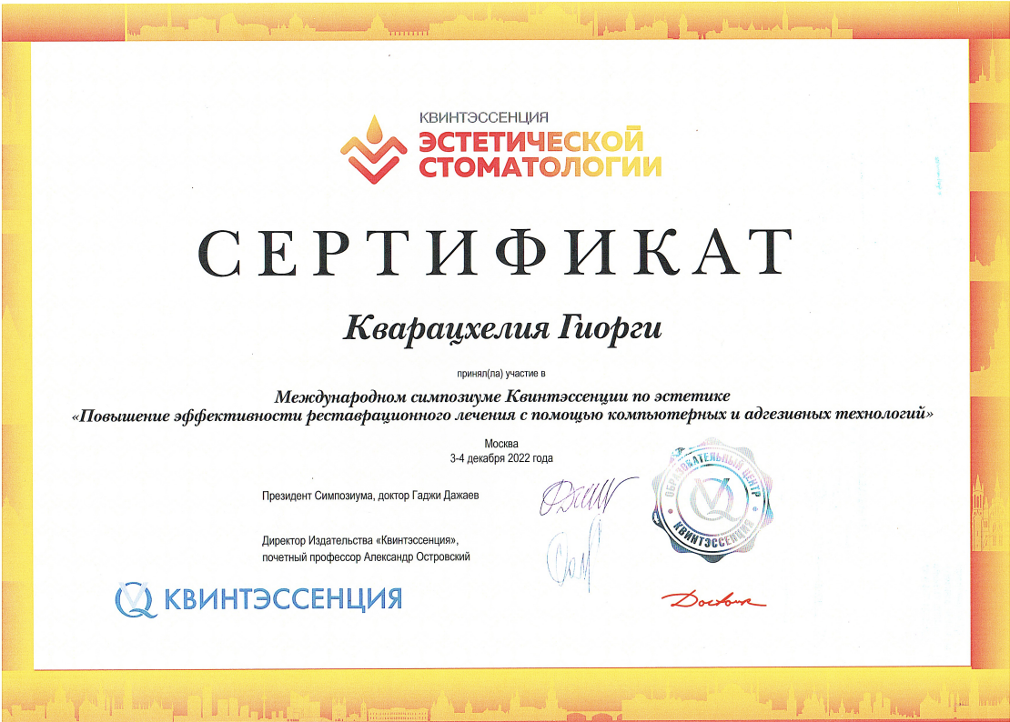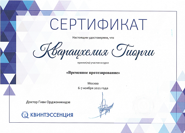 - 2021 г. - Образовательный курс “Планирование ортопедического лечения на зубах и имплантантах: от диагностики до реализации”, Москва, Россия.