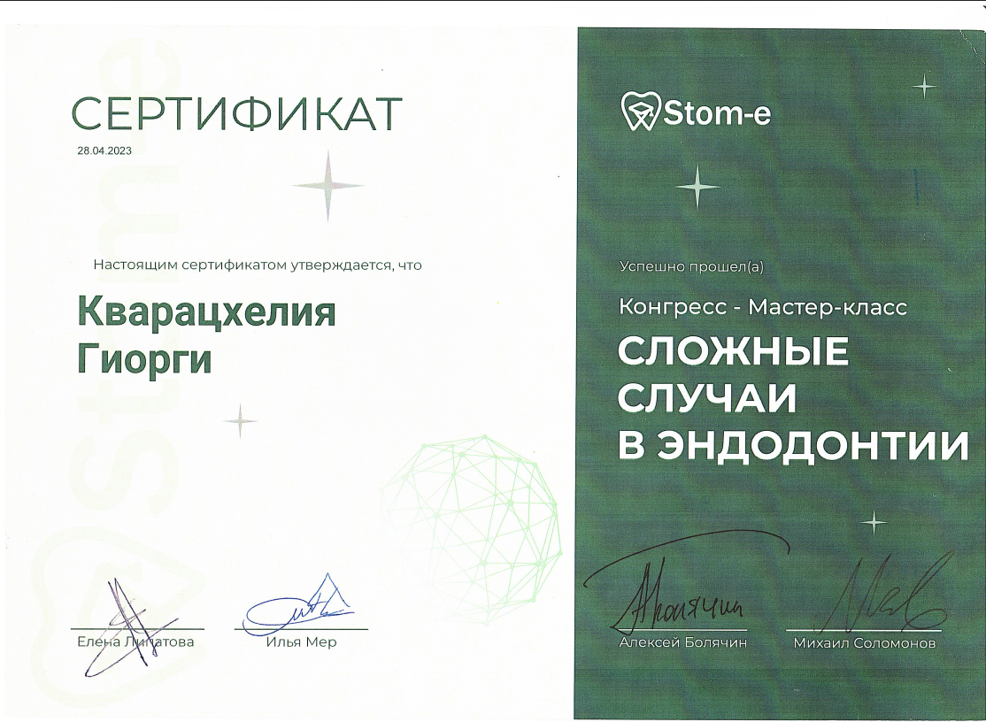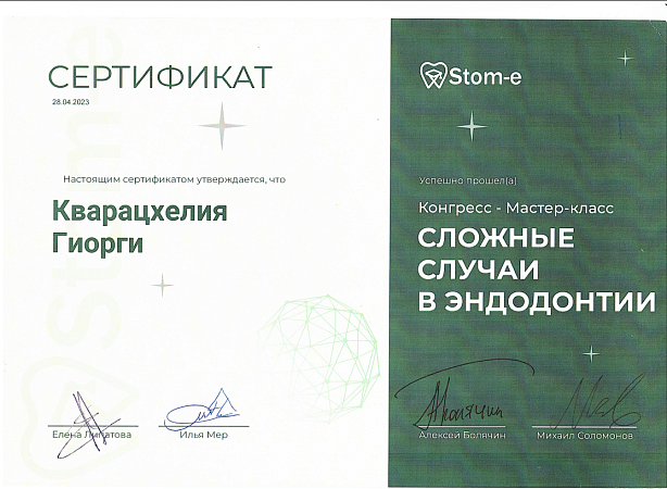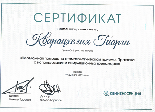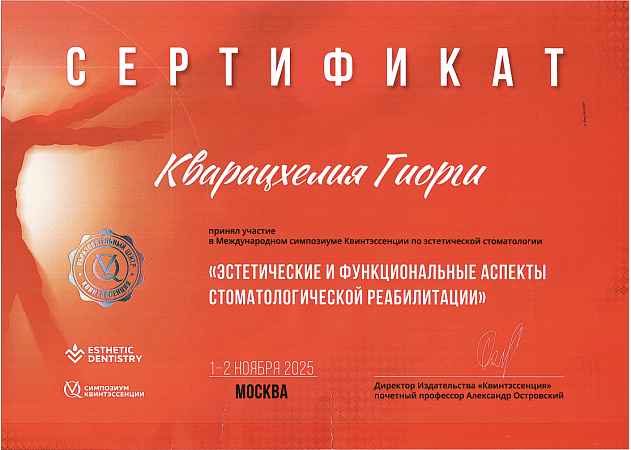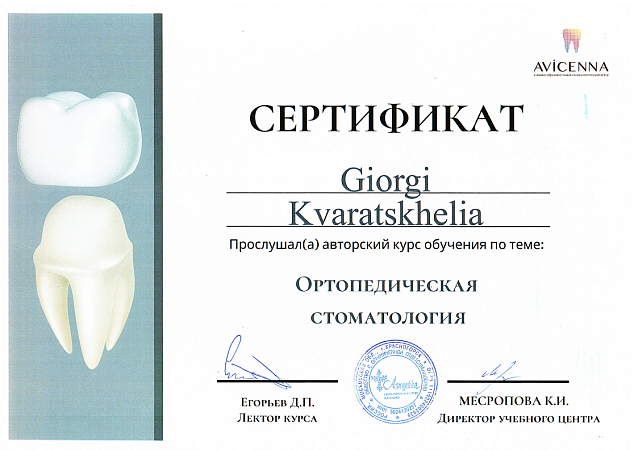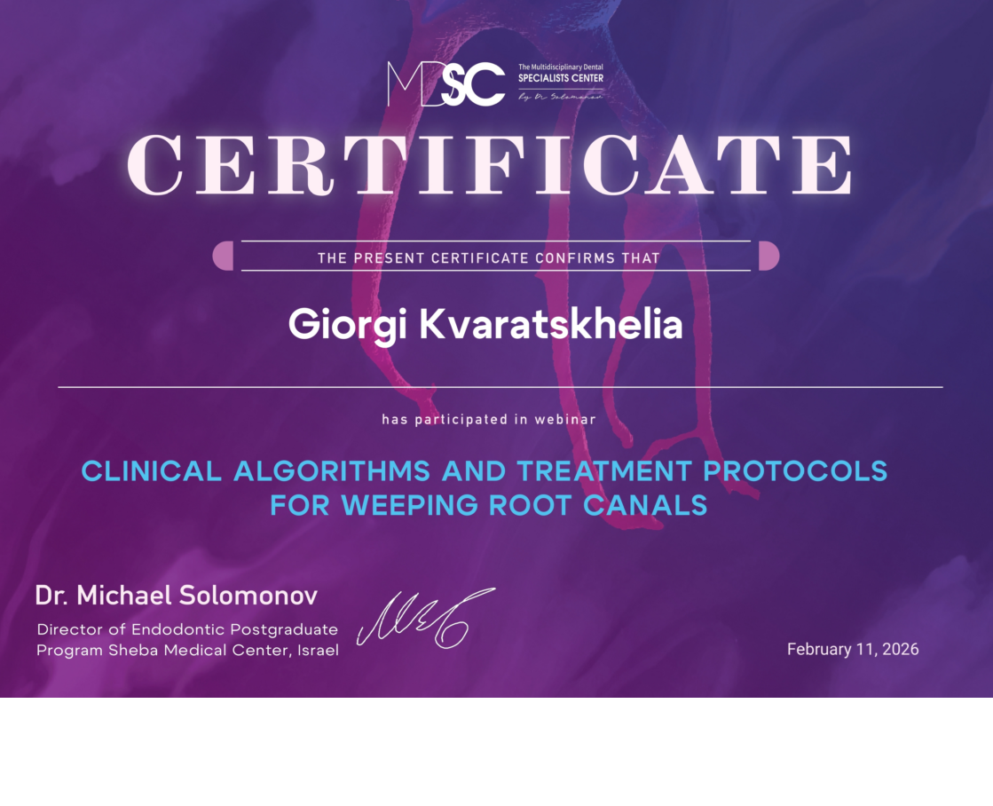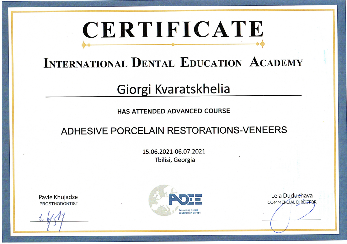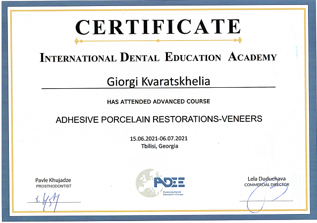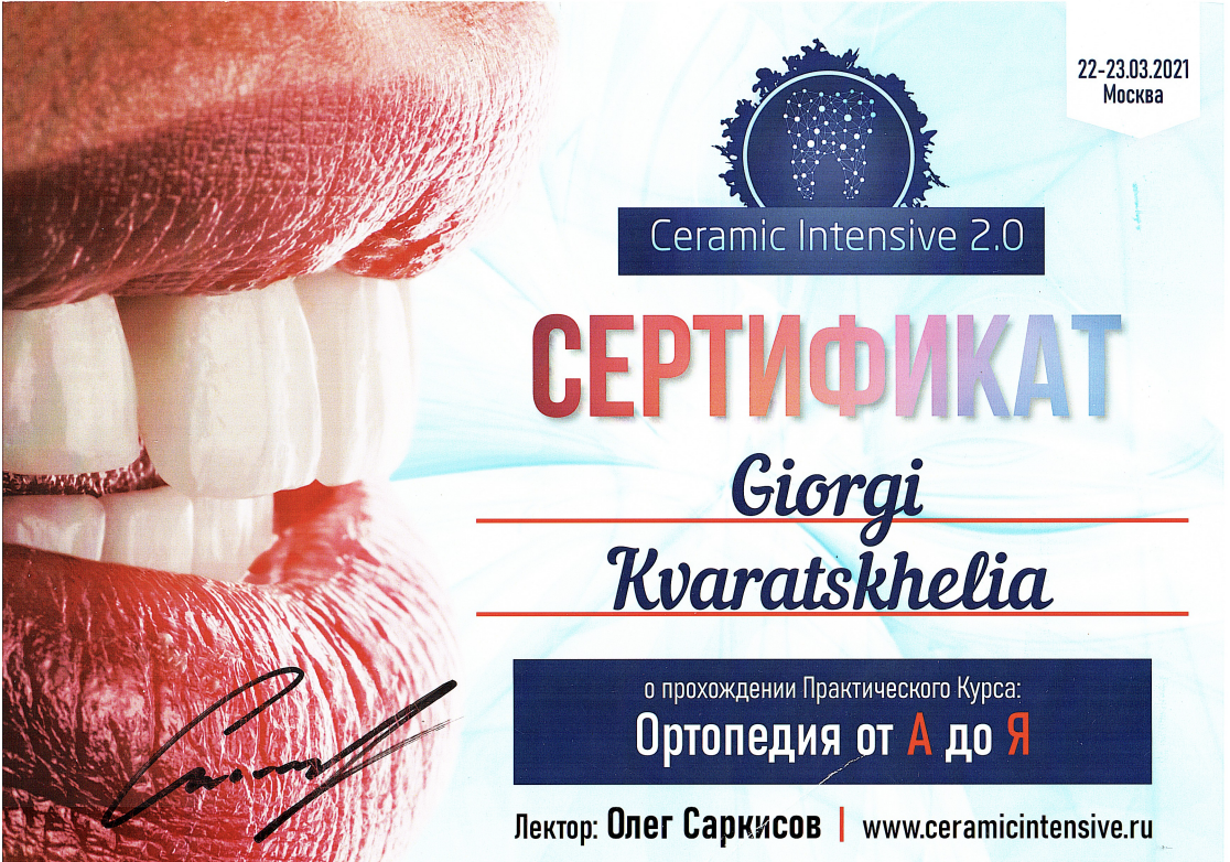 - 2016 г. - Международный Стоматологический Центр Албиус, Ординатура, Тбилиси, Грузия.