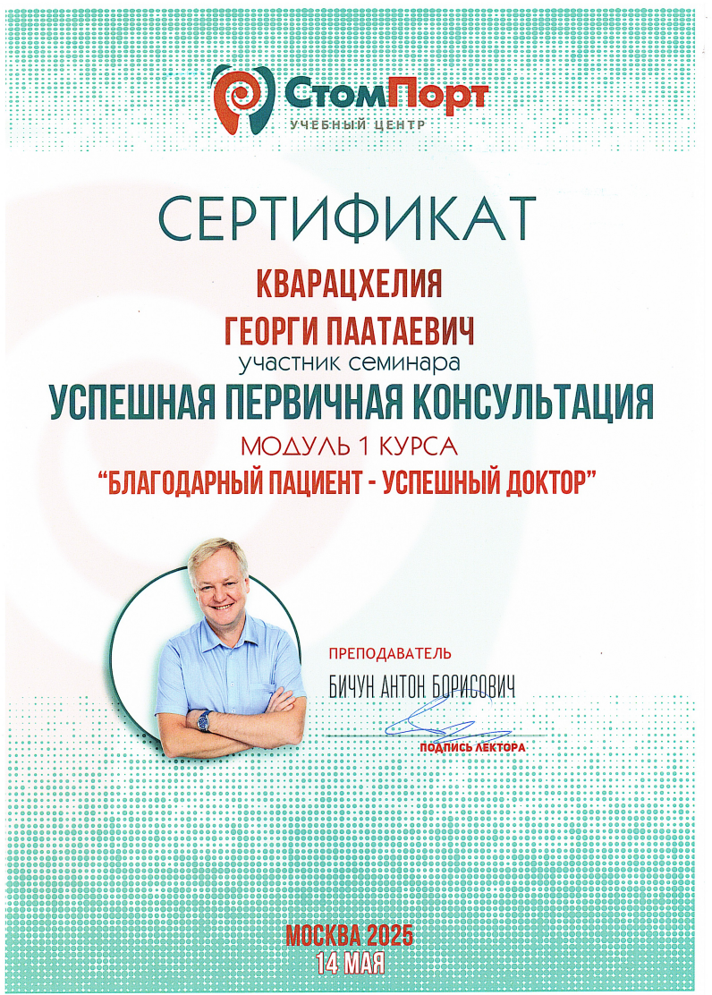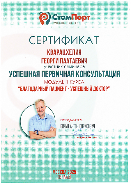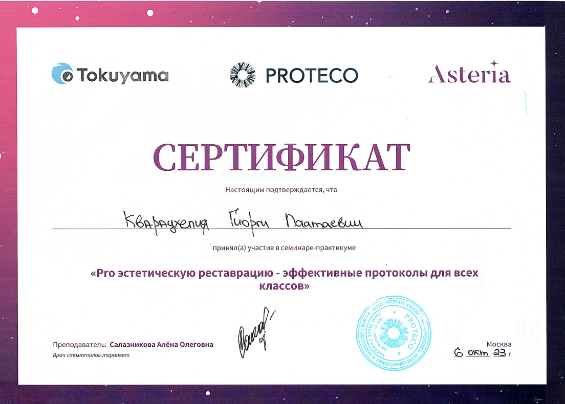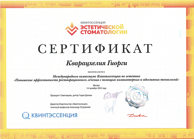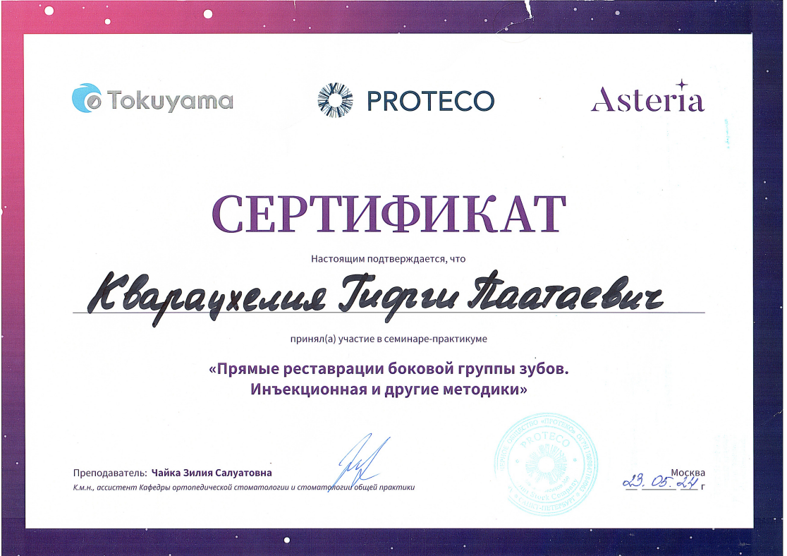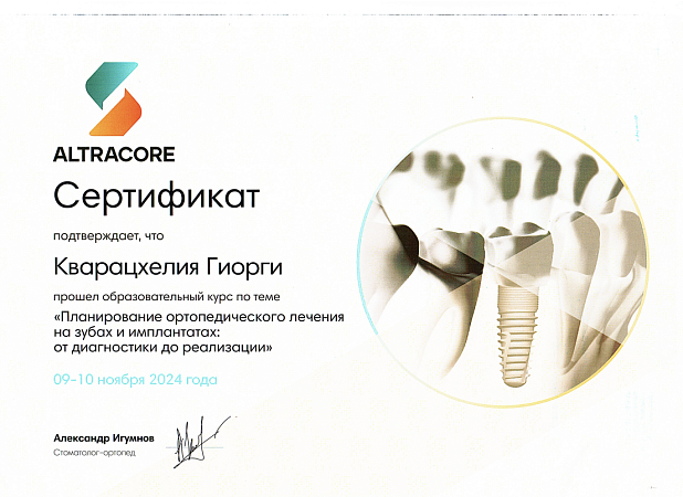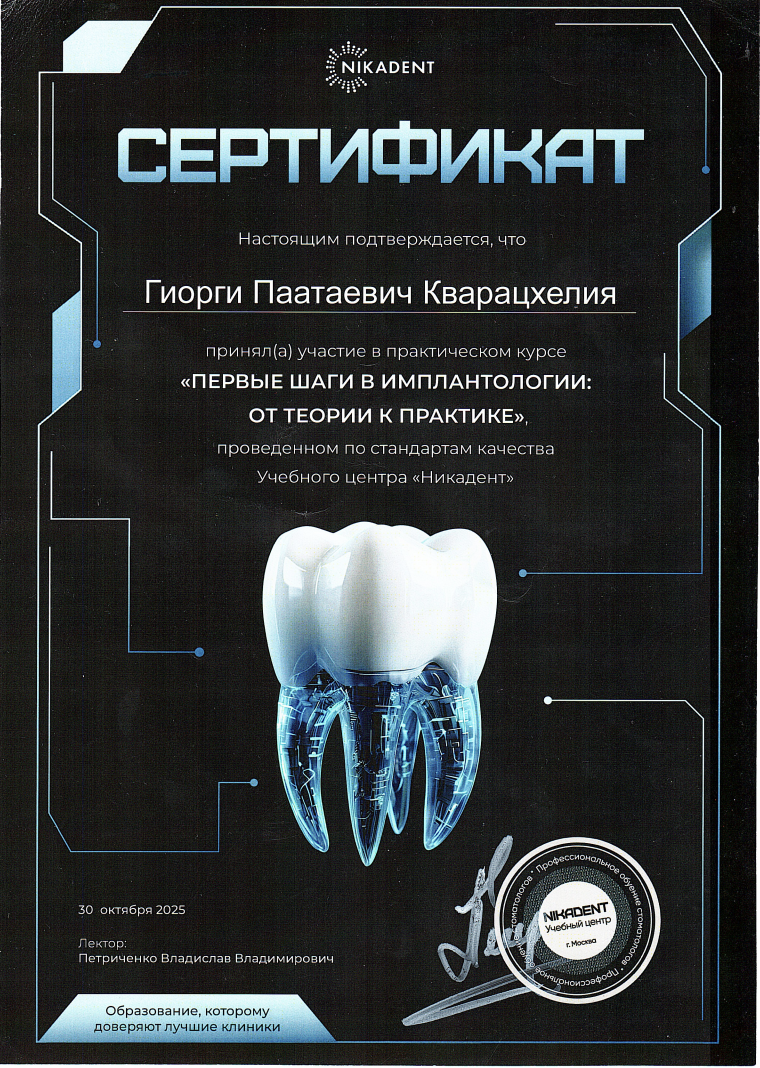 - 2016 г. - Международный Стоматологический Центр Албиус, Ординатура, Тбилиси, Грузия.