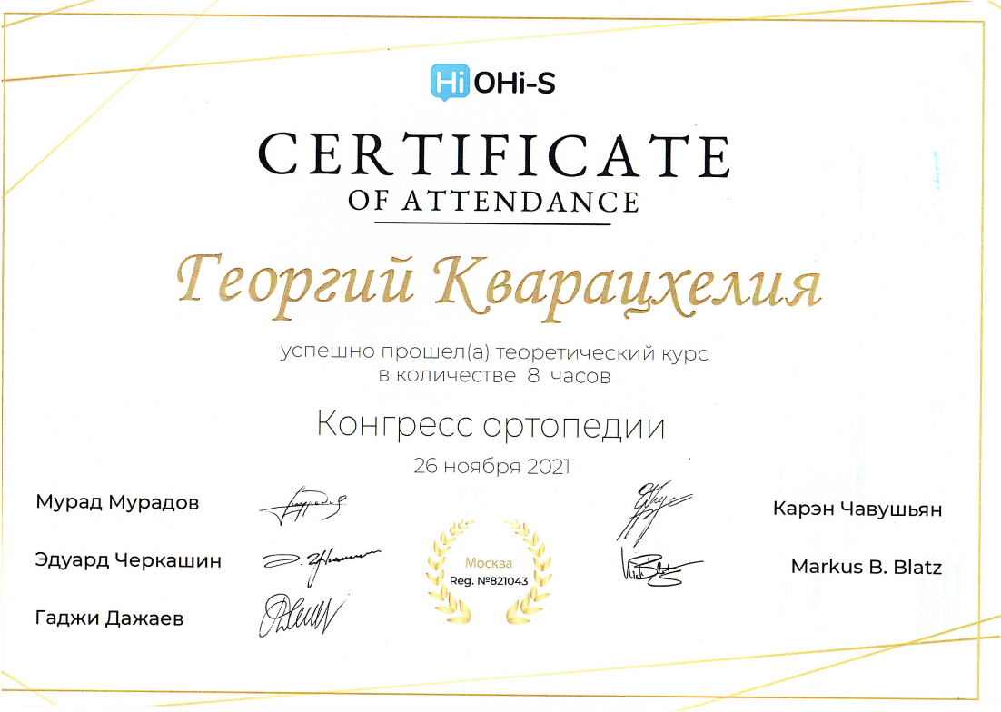 - 2021 г. - Практический курс “Ортопедия от А до я” , Москва, Россия.
