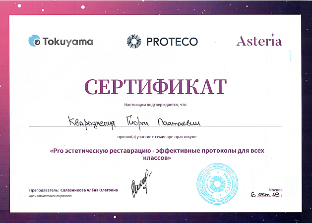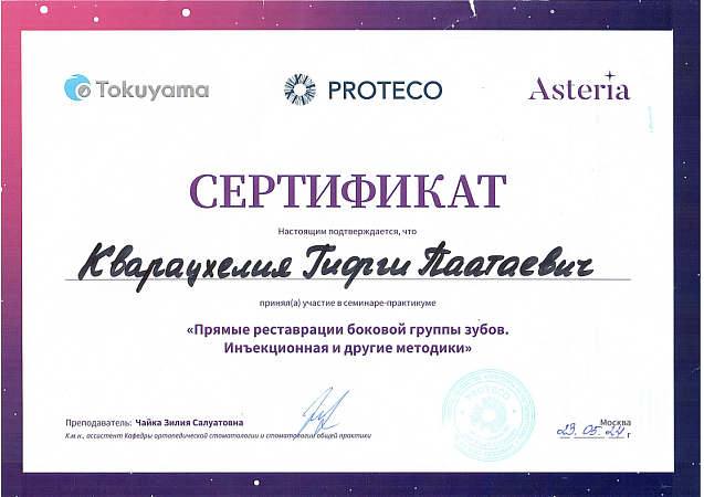 - 2021 г. - Курс обучения “Адгезивная стоматология” , Москва, Россия.