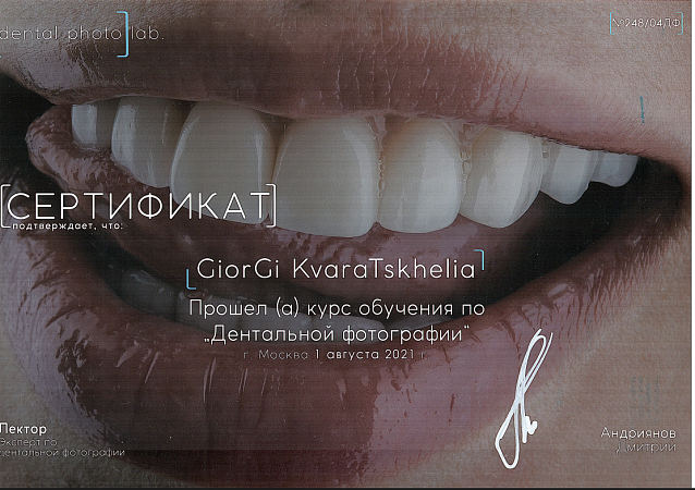 - 2021 г. - Курс обучения “Дентальная фотография”, Москва, Россия.