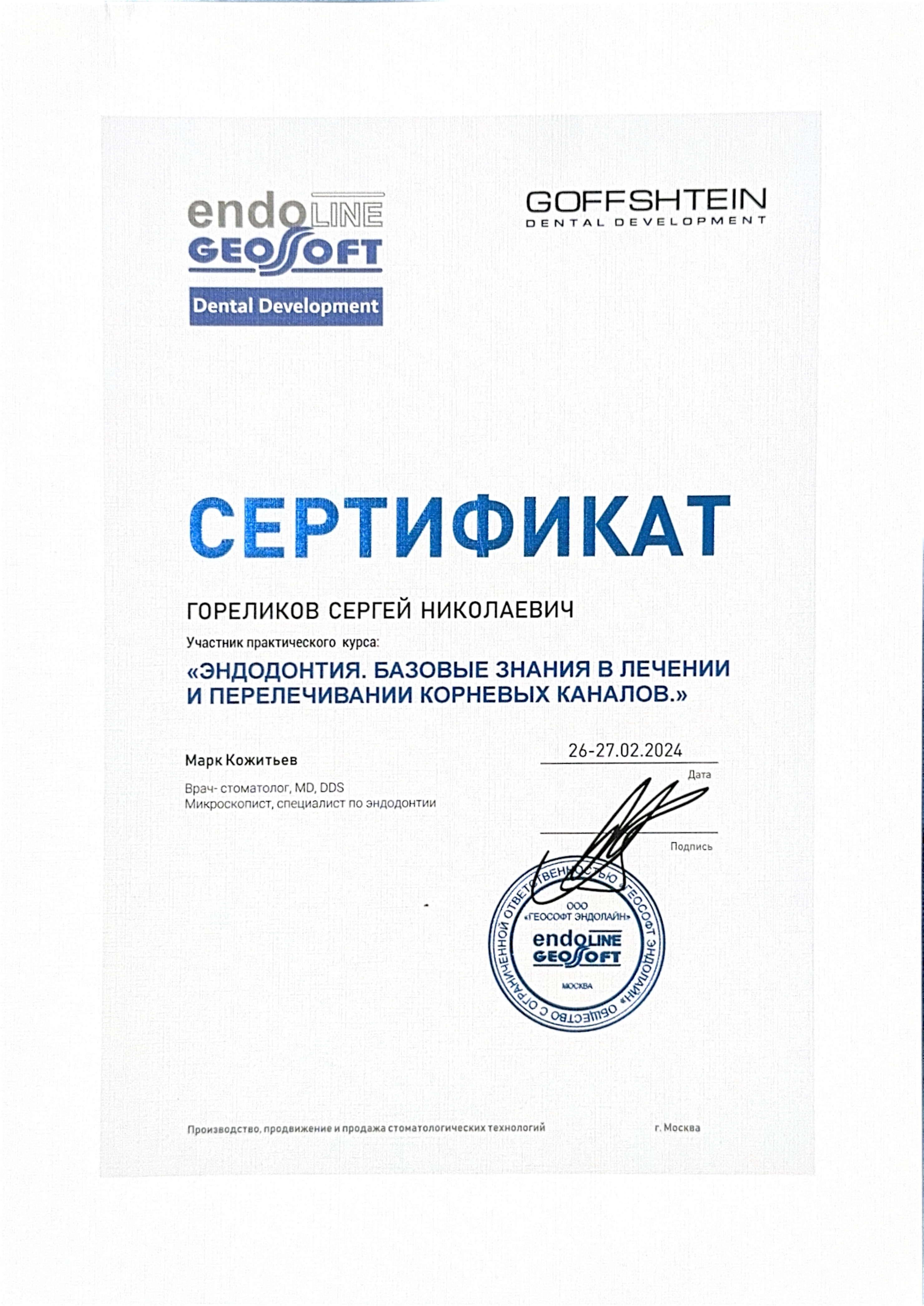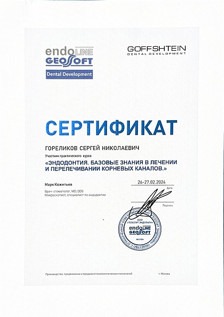 - 2023 г. Сертификат «Эндодонтия. Базовые знания и тактика в первичном лечении корневых каналов. Перелечивание» Кожитьев Марк / Goffshtein Dental Development / г. Москва.