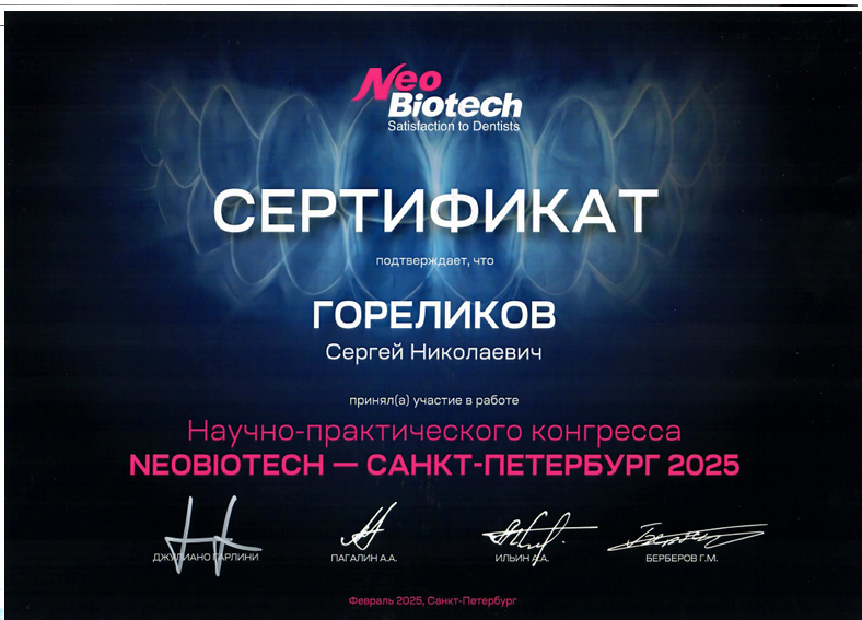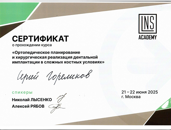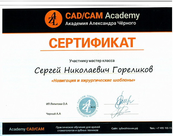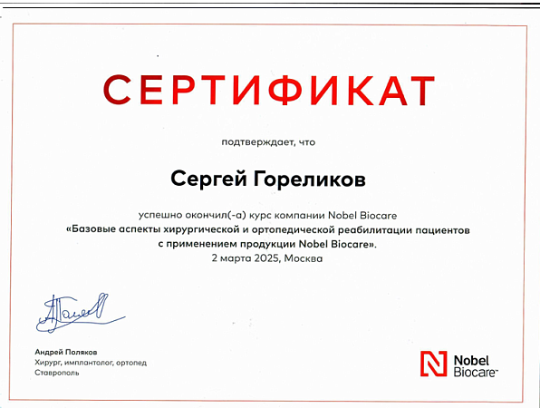 - 2015 г. Сертификат «Основы планирования и этапы ортопедического лечения с использованием имплантов.