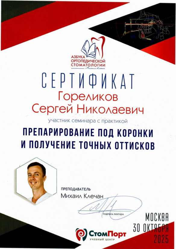 - 2025 г. Сертификат «Семинар с практикой «Препарирование под коронки и получение точных оттисков»» СтомПорт, лектор Михаил Клечан / г. Москва.