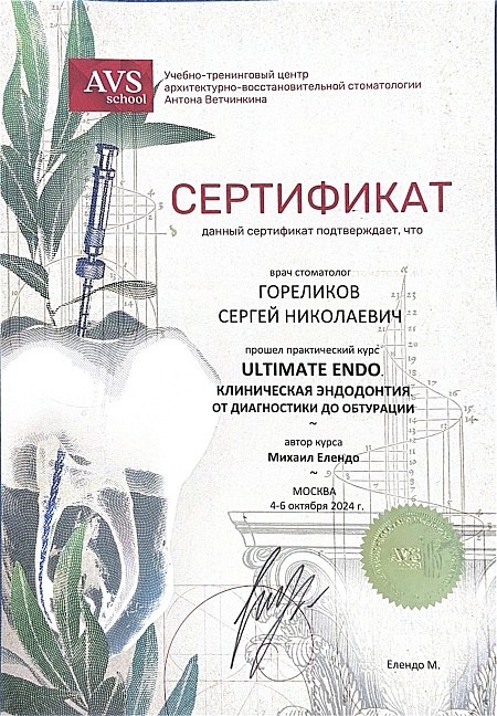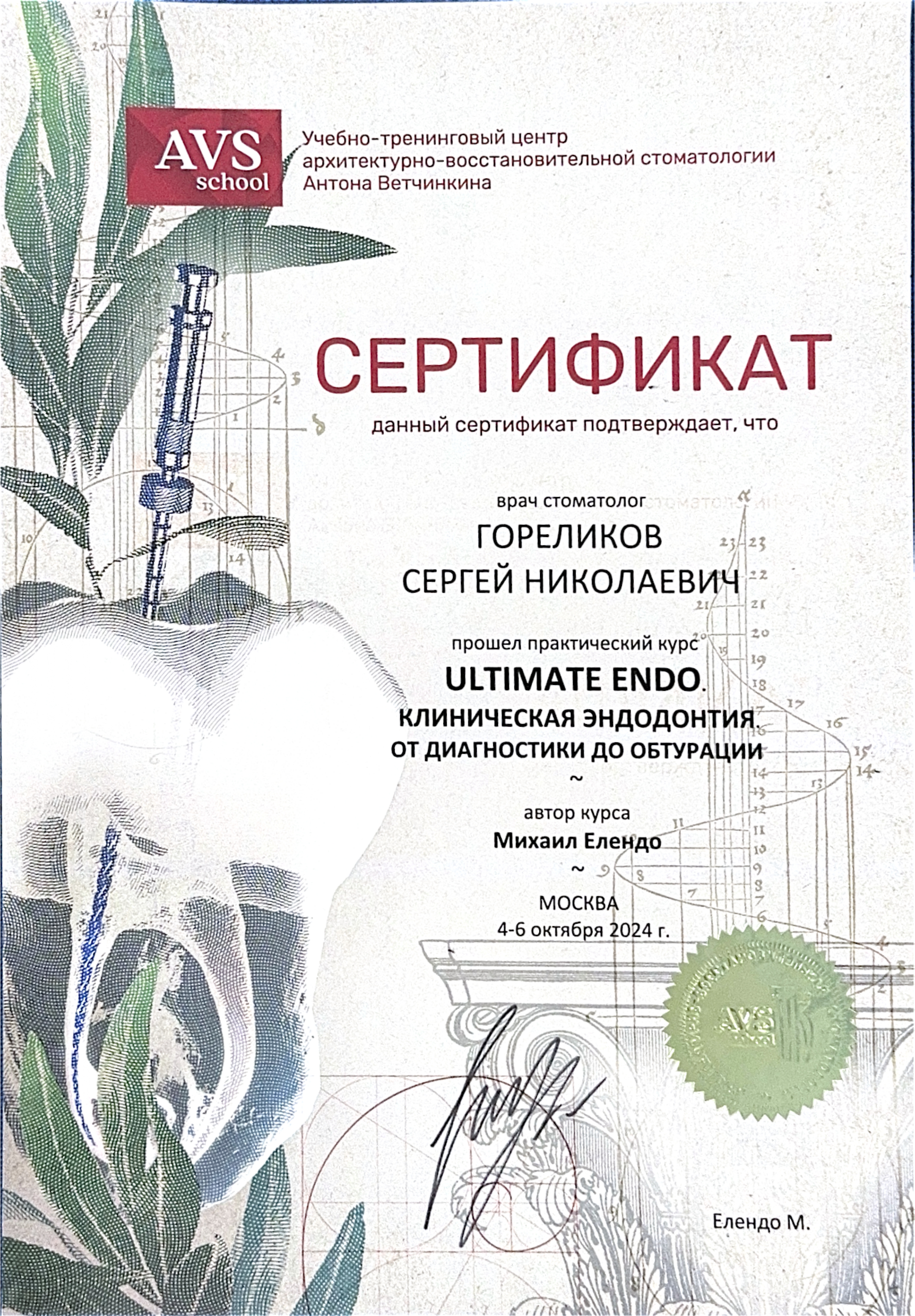 - 2024 г. Сертификат «Ultimate Endo. Клиническая эндодонтия: от диагностики до обтурации» AVS school / Елендо Михаил / г. Москва.