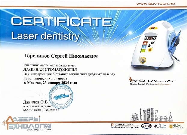 - 2025 г. Сертификат «Участник лекции и мастер-класса по лазерной стоматологии. Применение диодных лазеров в практике врача стоматолога» Laser Dentistry / г. Москва.