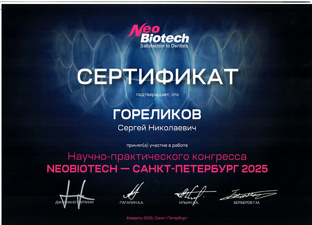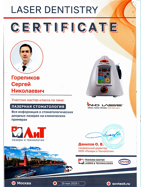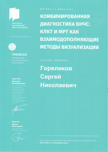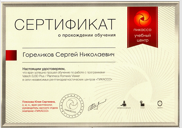 - 2014 г. Сертификат «Конусно-лучевая томография в практике врача стоматолога»