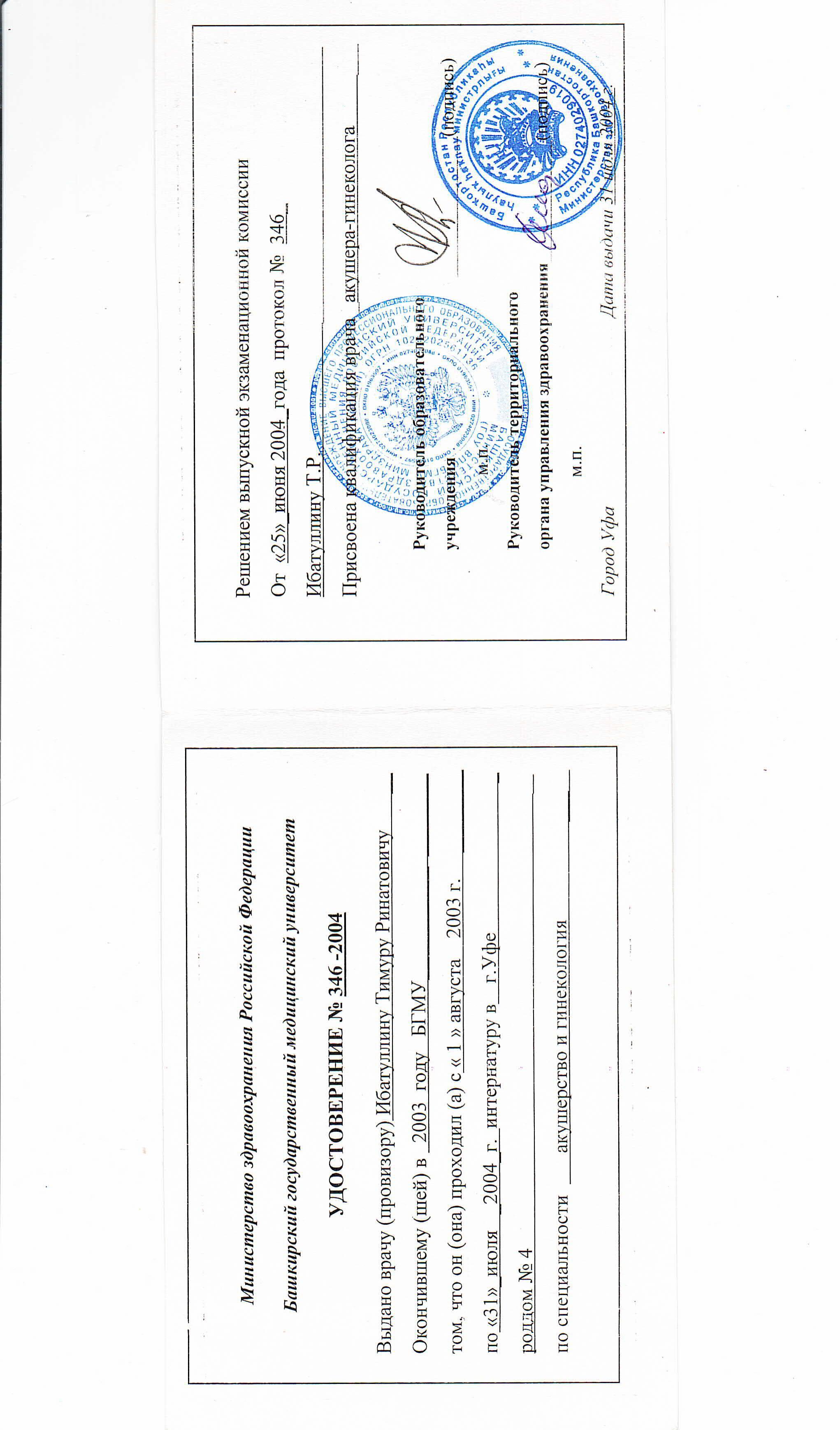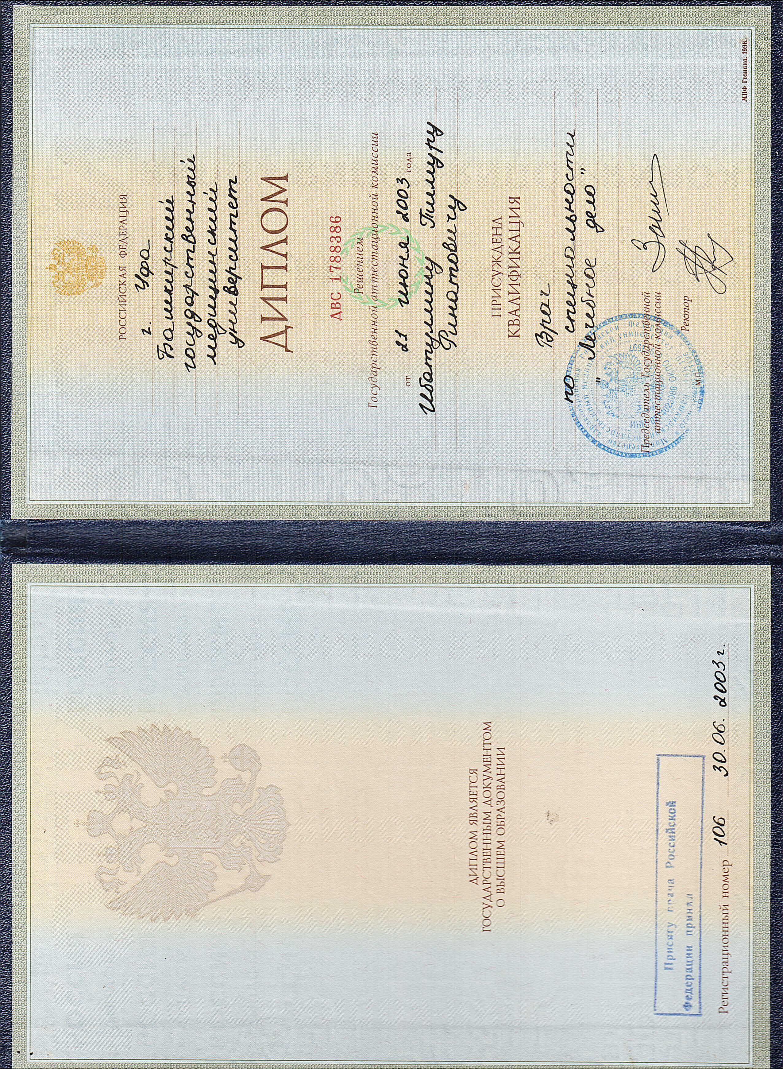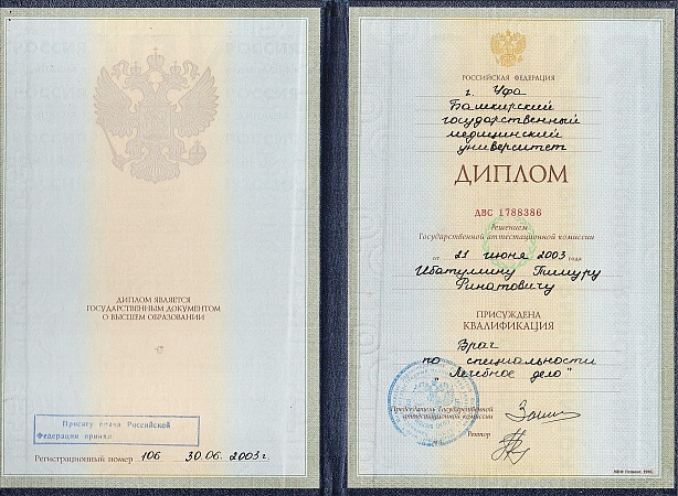 - Окончил Башкирский государственный медицинский университет в 2003 г.;