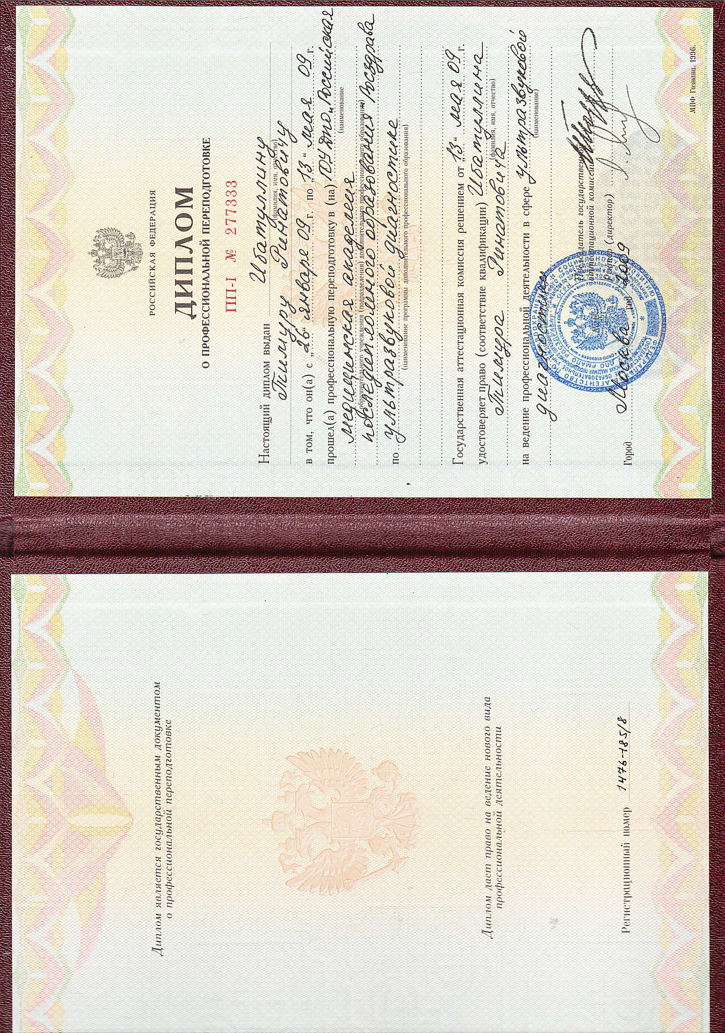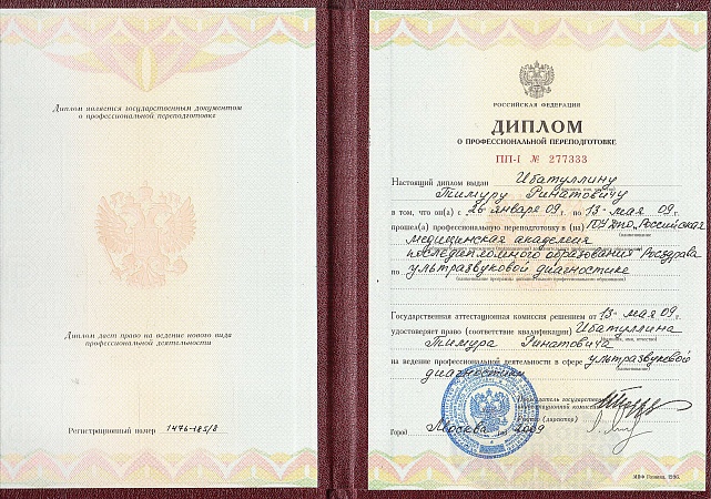 - В 2009 г. прошел профессиональную переподготовку по специальности «Ультразвуковая диагностика» на базе РМАПО г. Москва.