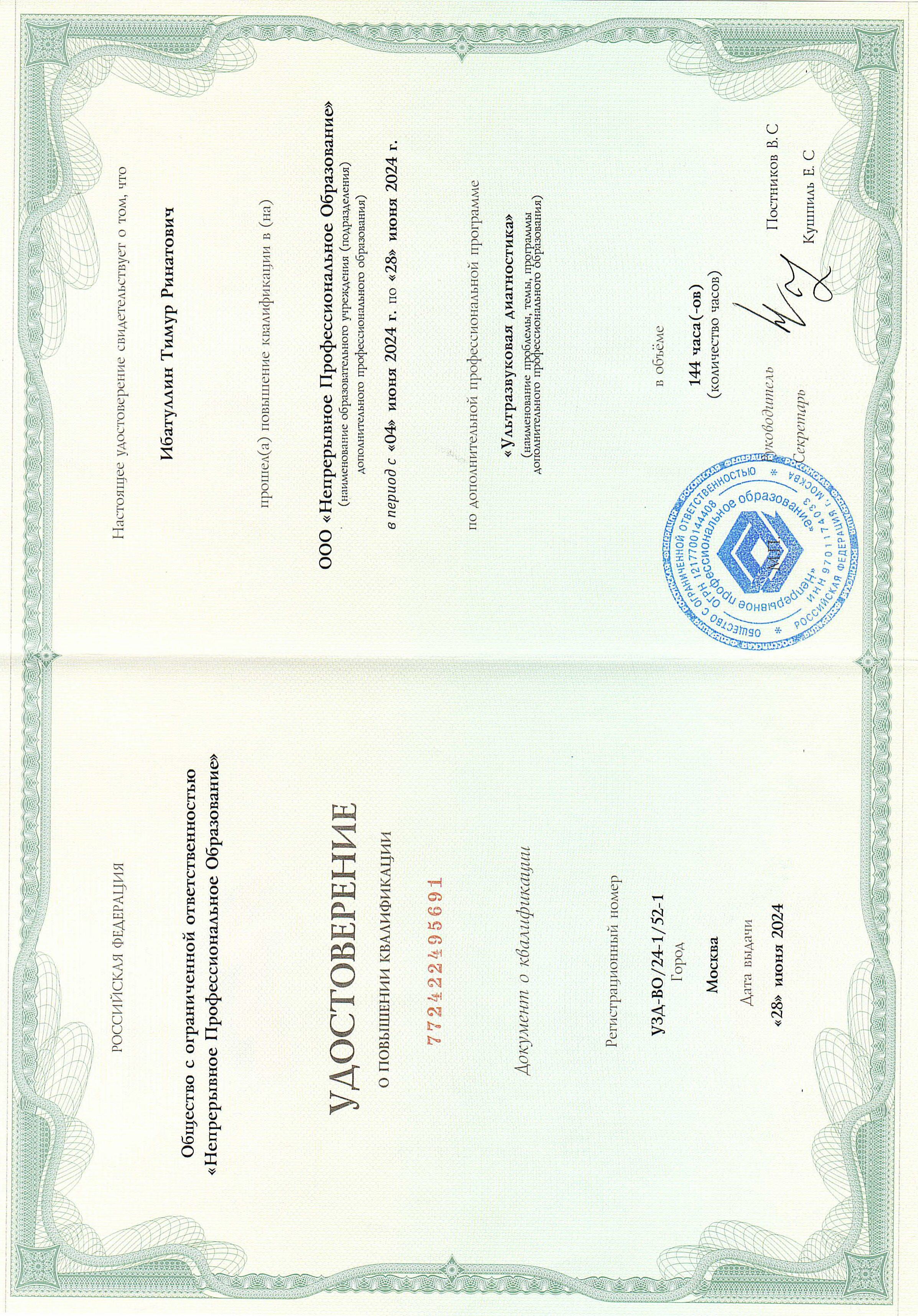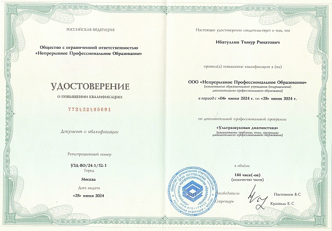 - 2024 г. - Повышение квалификации и государственная аттестация по специальности «Ультразвуковая диагностика».
