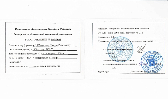 - В 2004 г. Интернатура по специальности «Акушерство и гинекология»;