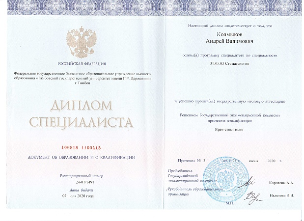 - 2020 г. - ТГУ им. Г.Р. Державина «Медицинский Институт»;