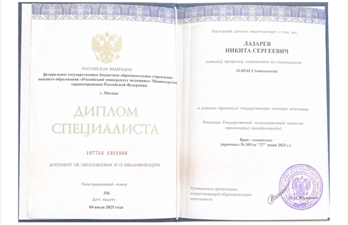 Лазарев Никита Сергеевич - квалифицированный врач-стоматолог-хирург, имплантолог. Специализация: проведение сложных операций, установка зубных имплантов и восстановление эстетического вида улыбки пациентов.