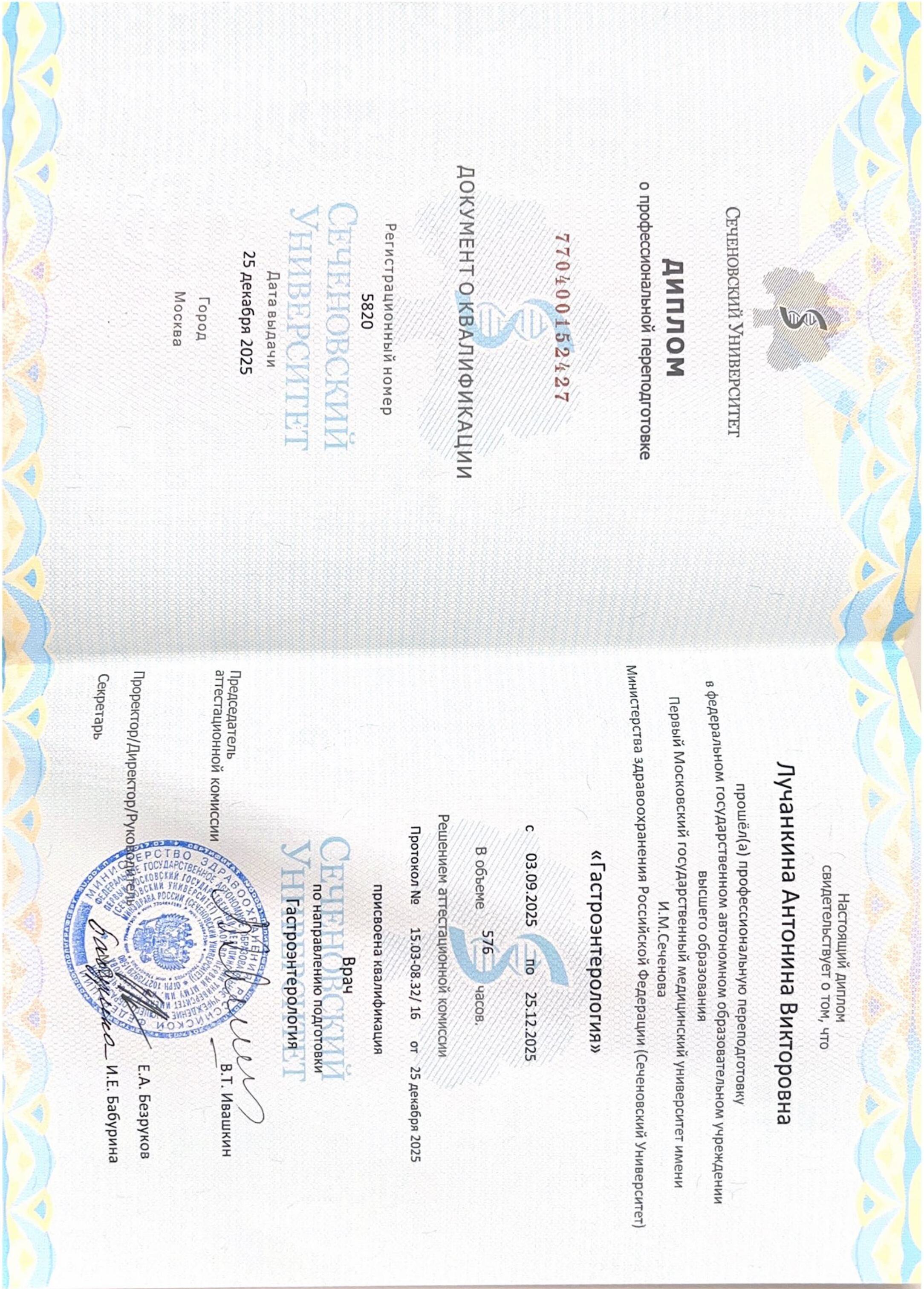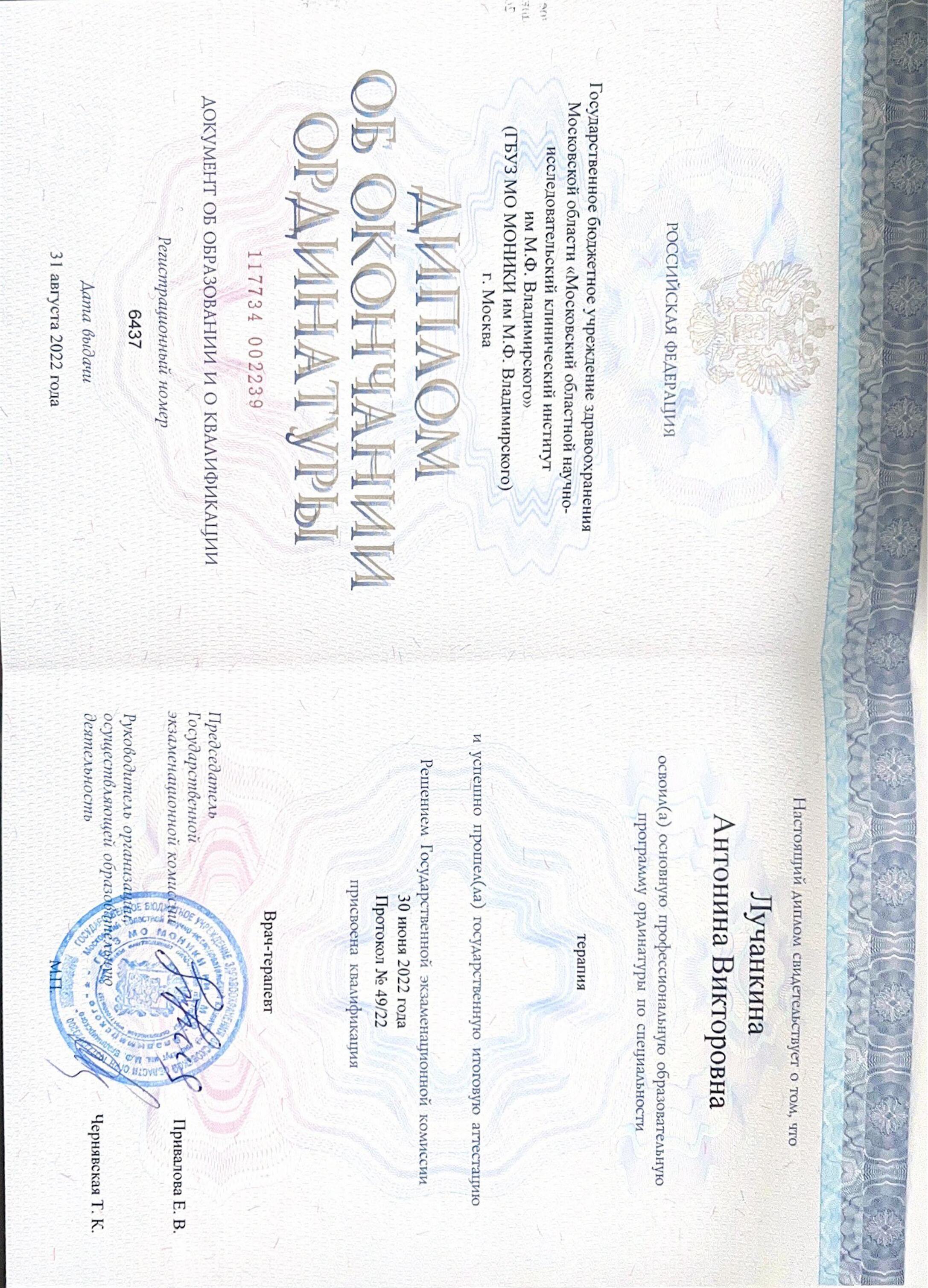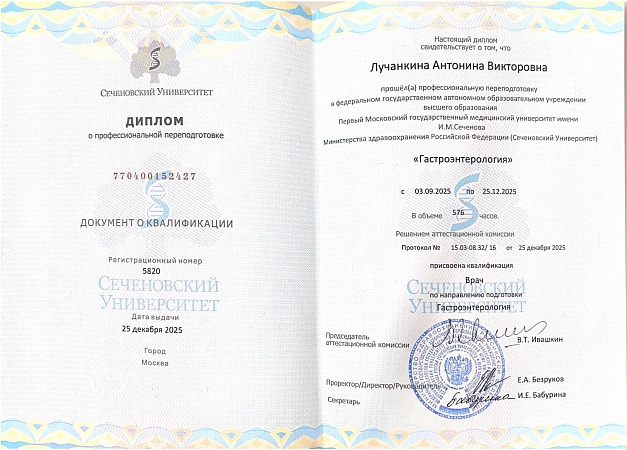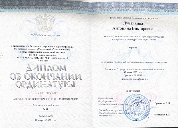 2025 г. - "Московский областной научно-исследовательский институт им. М.Ф. Владимирского", факультет терапии.