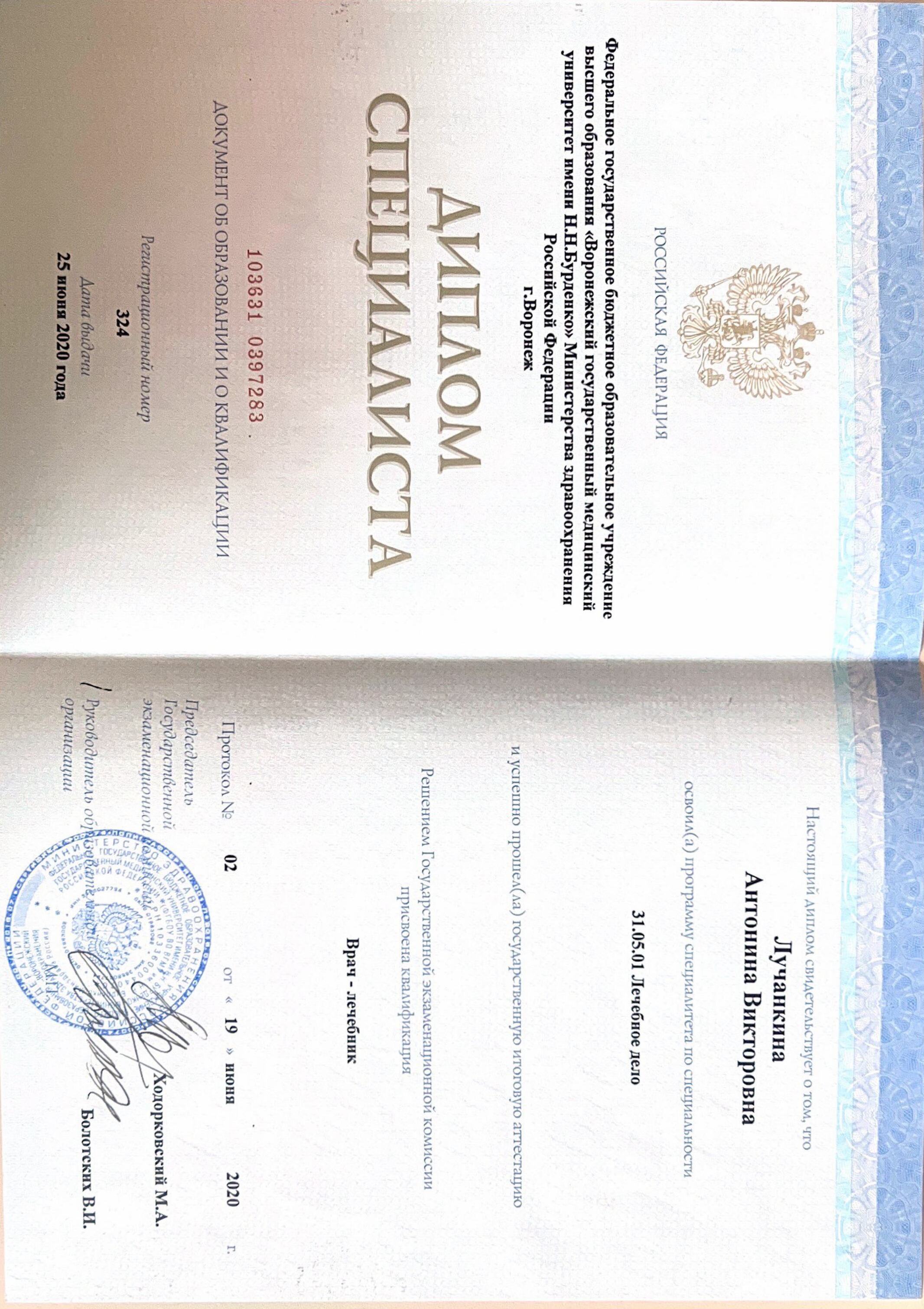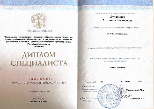 2022 г. - ФГБОУ "Воронежский государственный медицинский университет им. Н.Н. Бурденко", факультет "Лечебное дело".
