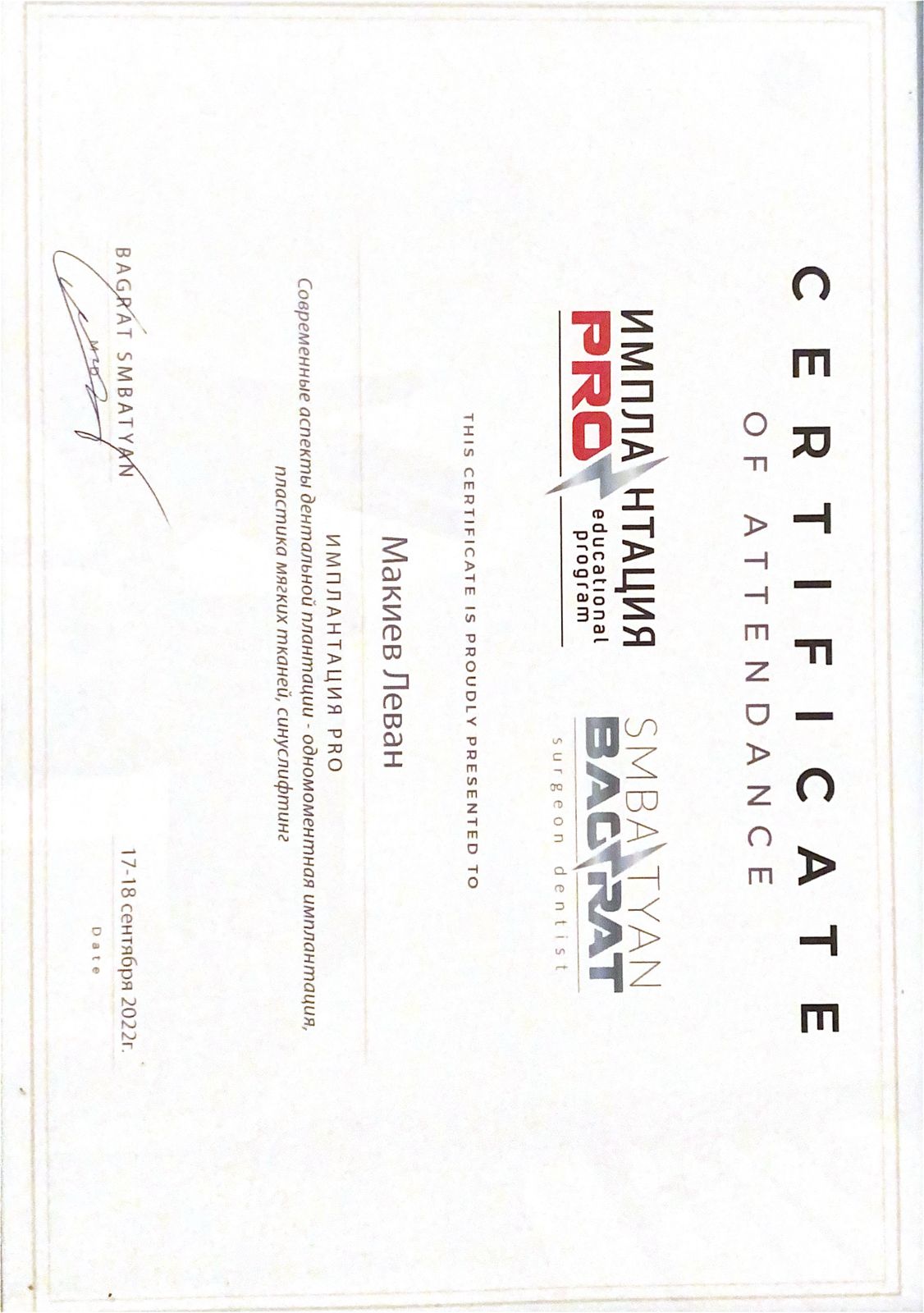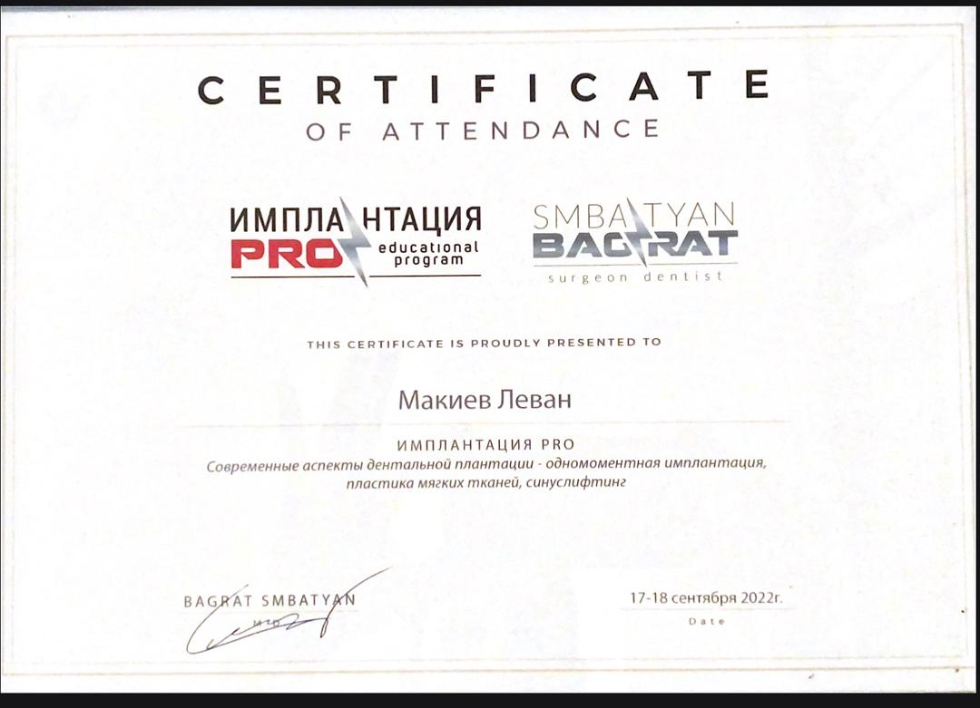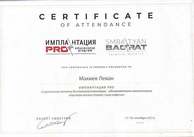 В 2022 г. проходил повышение квалификации по программе « Современные аспекты дентальной имплантации-одномоментная имплантация, пластика мягких тканей, синуслифтинг».