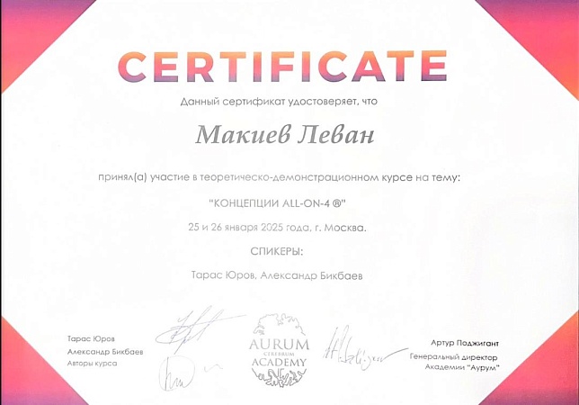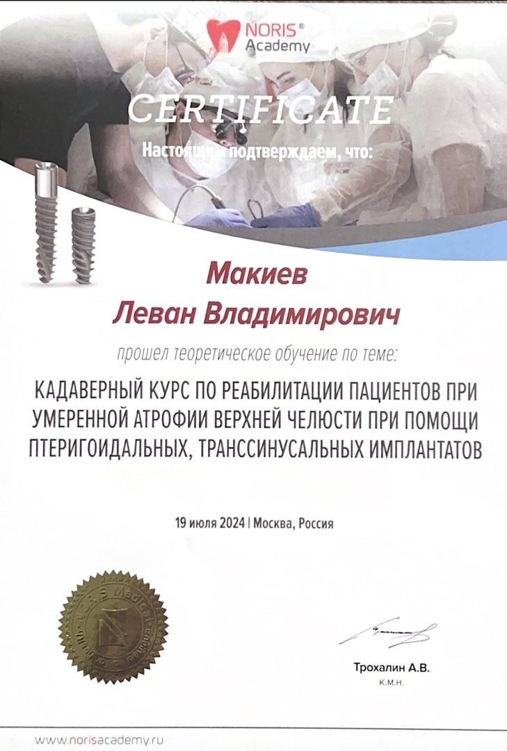 - В 2023 г. проходил повышение квалификации по программе « Дентальная имплантация»