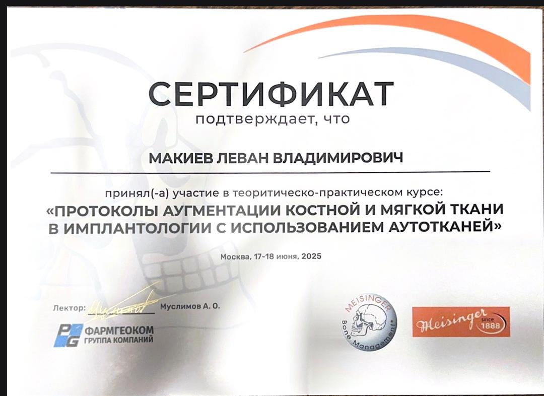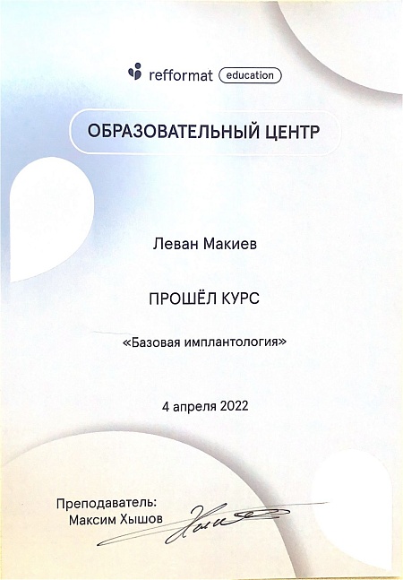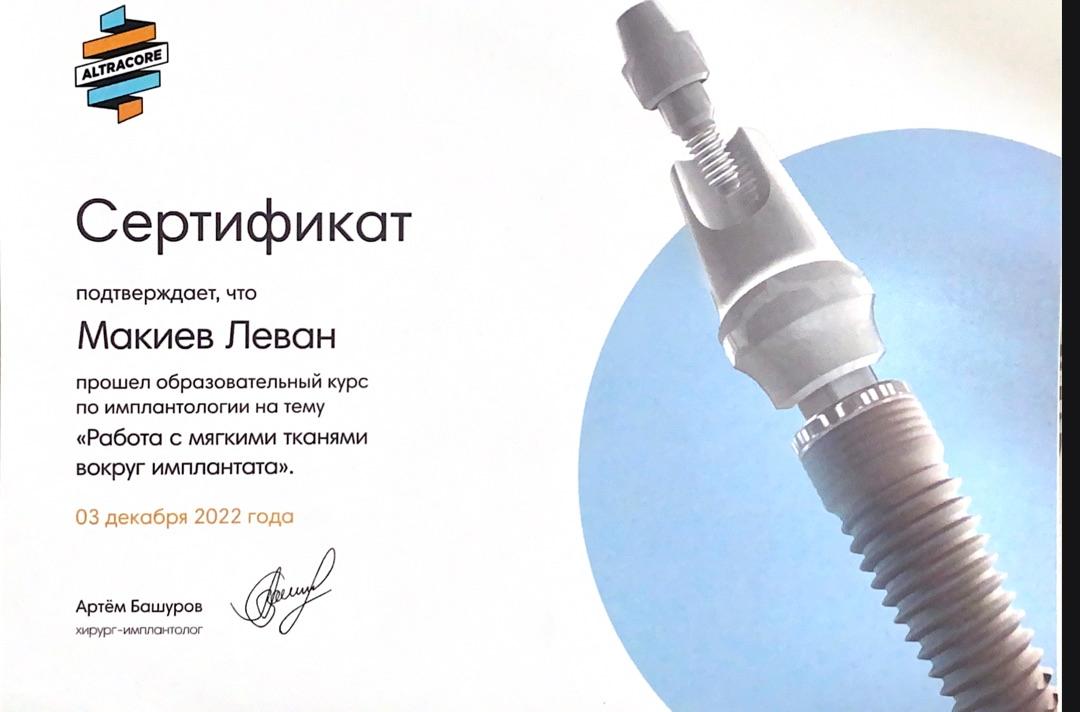 В 2022 г. проходил образовательный курс по имплантологии на тему «Работа с мягкими тканями вокруг имплантанта».