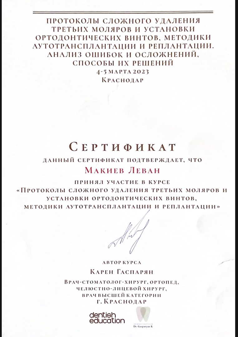 В 2023 г. принял участие в курсе «Протоколы сложного удаления третьих моляров и установки ортодонтических винтов, методики аутотрансплплантации и реплантации».