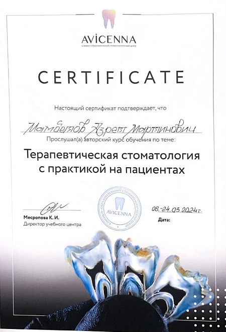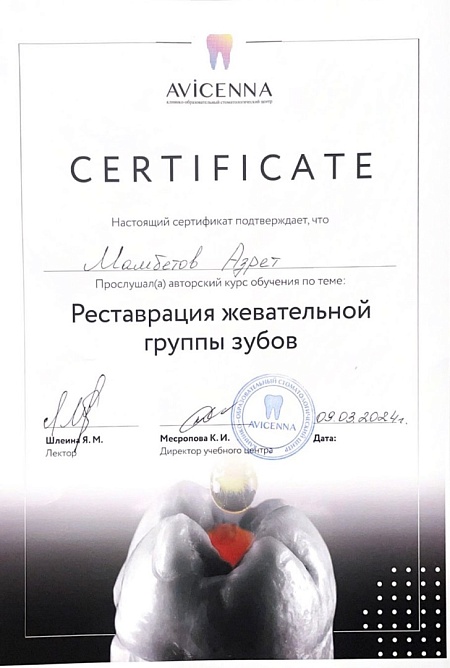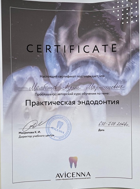 - 2025 г. - Центральная государственная медицинская академия управления делами Президента Российской Федерации. Специальность: стоматолог общей практики.